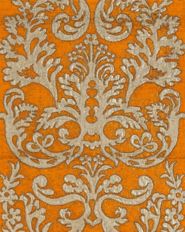 Highly saturated orange brocade with silver brocade appliqué featuring a symmetrical floral design. The borders of the silver brocade are lined with gilt wrapped silk cord.