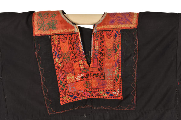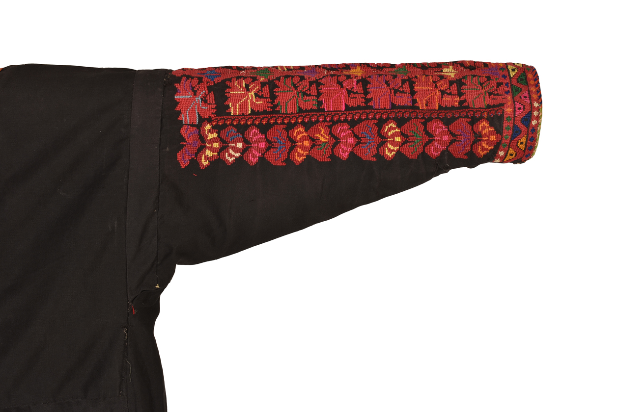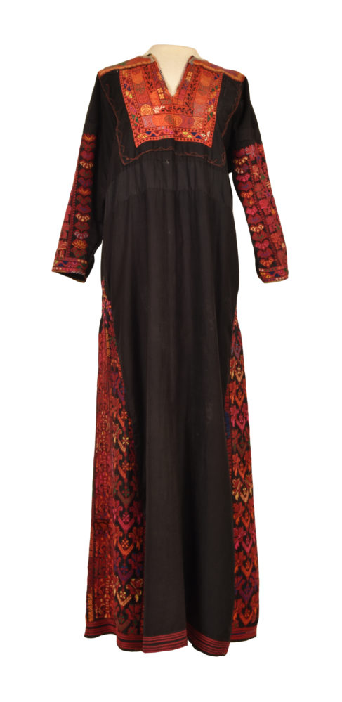 Bedouin woman s dress. A full length garment with flared skirt and long sleeves. The black cotton ground is heavily embroidered at the back and sides of the skirt, the sleeves and the front neck area. The embroidery is done with silk in cross stitch. The motifs are varied, mostly rows of flowers, leaves and some geometricals.