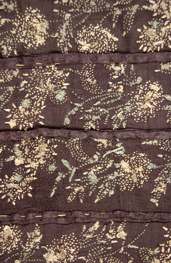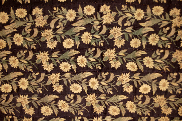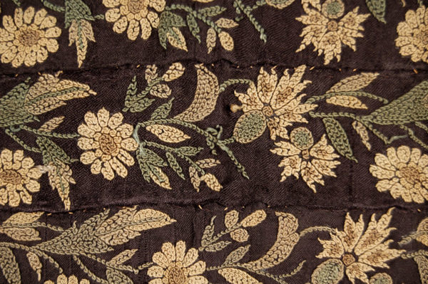 Embroidery of very distinct characteristics developed in the urban center of Surat on the northwest coast of India. A colony of Chinese immigrants produced garments for another immigrant colony, that of the Parsees which originate in Iran. The design, as well as the stitches used, are typically Chinese. Yet the garments are Indian in form, such as saris, small round skull caps and blouses.The saris were either completely covered with embroidery or with embroidered borders. The borders, once the sari was worn,were used to form square panels used as covers. The embroidery of this panel,composed of a sari border, is executed in Peking stitch,also known as French knot or the forbidden stitch, thus named as it was very straining on the eyes of the embroiderer and at some point it was banned (unsuccessfully)by the Chinese authorities.