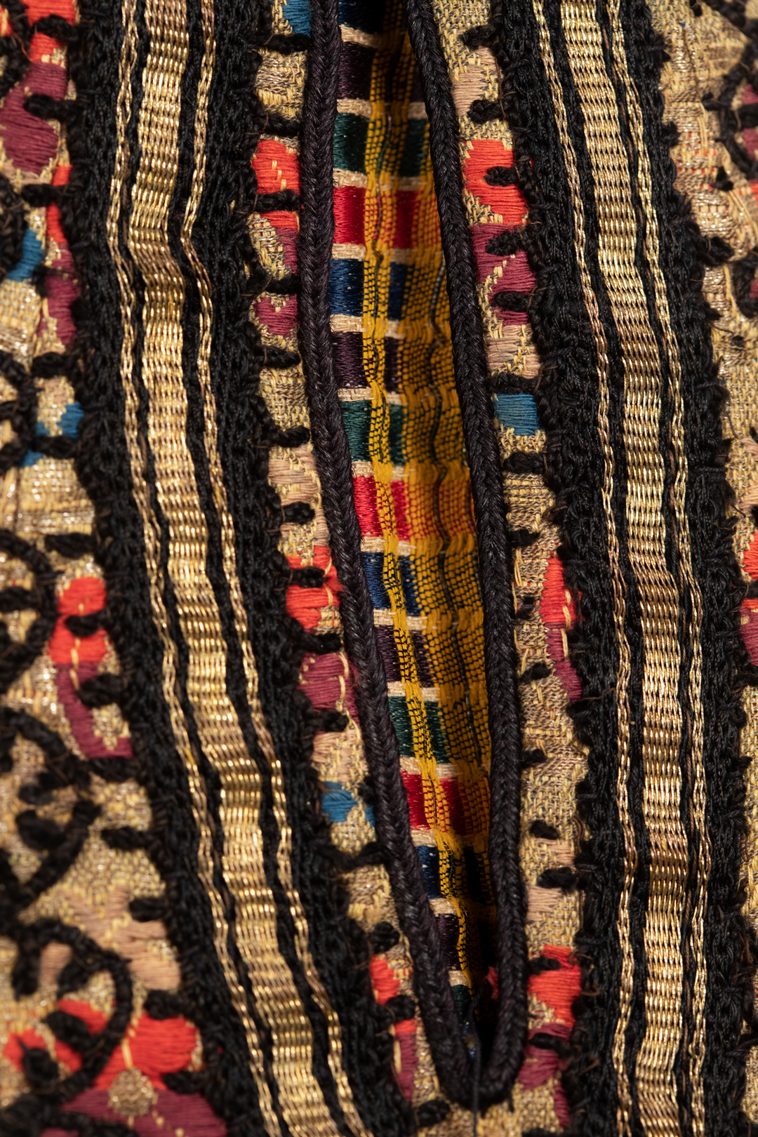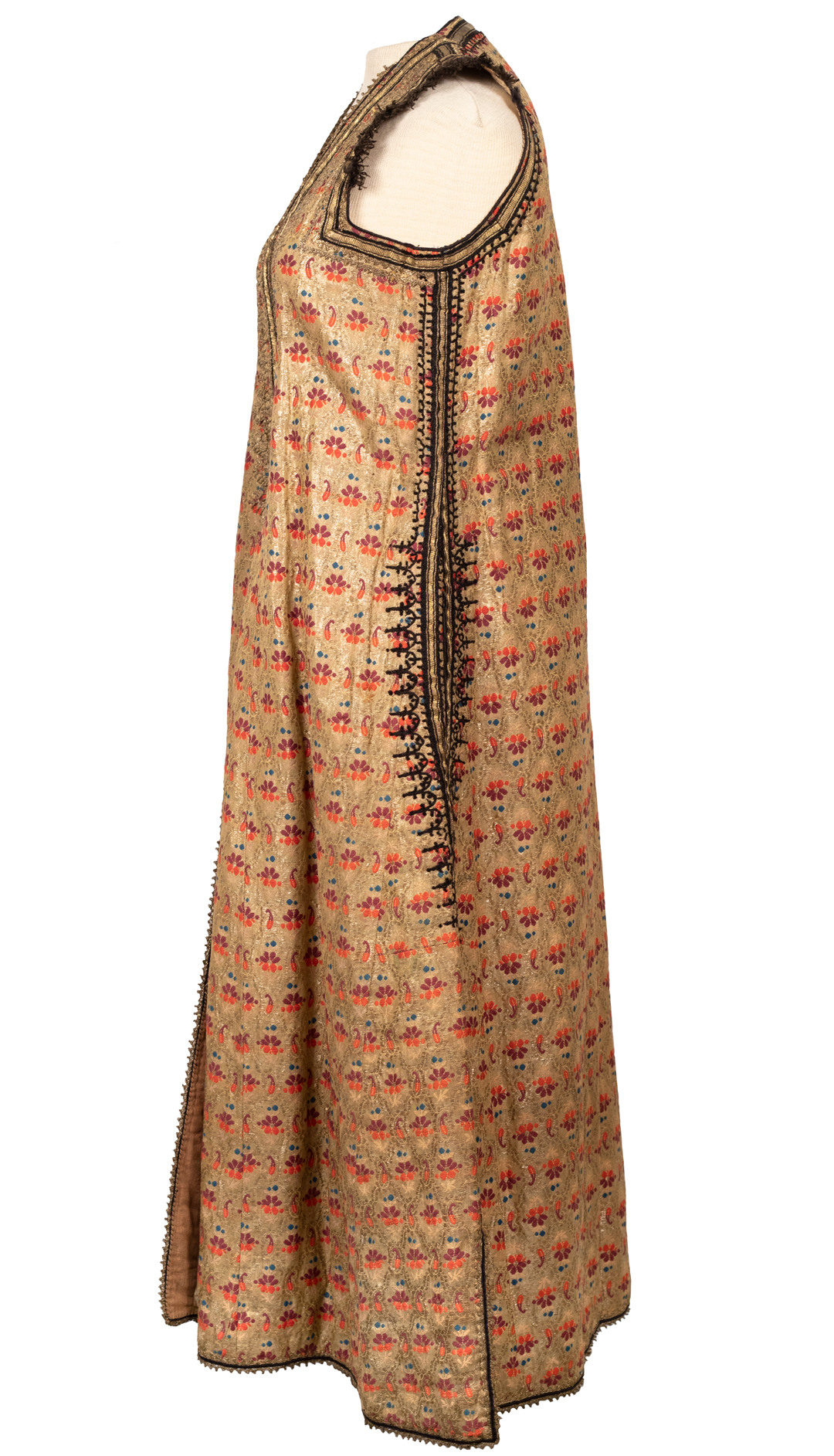 The coat is made of brocade with an overall boteh pattern on a pale mustard yellow ground. The front and arm openings are edged with gold ribbon and black silk fringe. Along every border is couched gold embroidery.