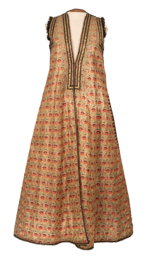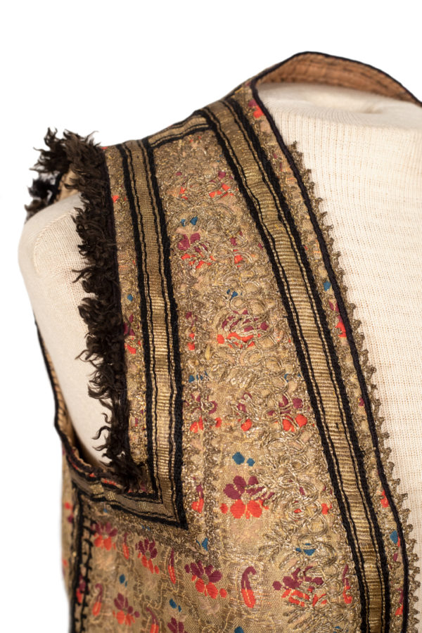 This brocade vest was a part of a woman’s outfit in 19th century Iran. It would have been worn over a loose-fitting shirt and either a skirt or pants. A jacket would be worn on top.