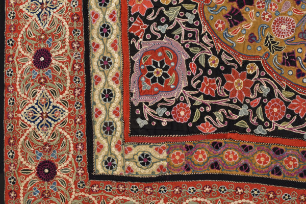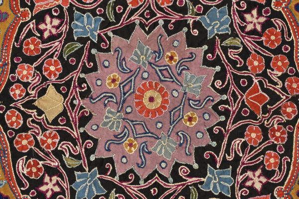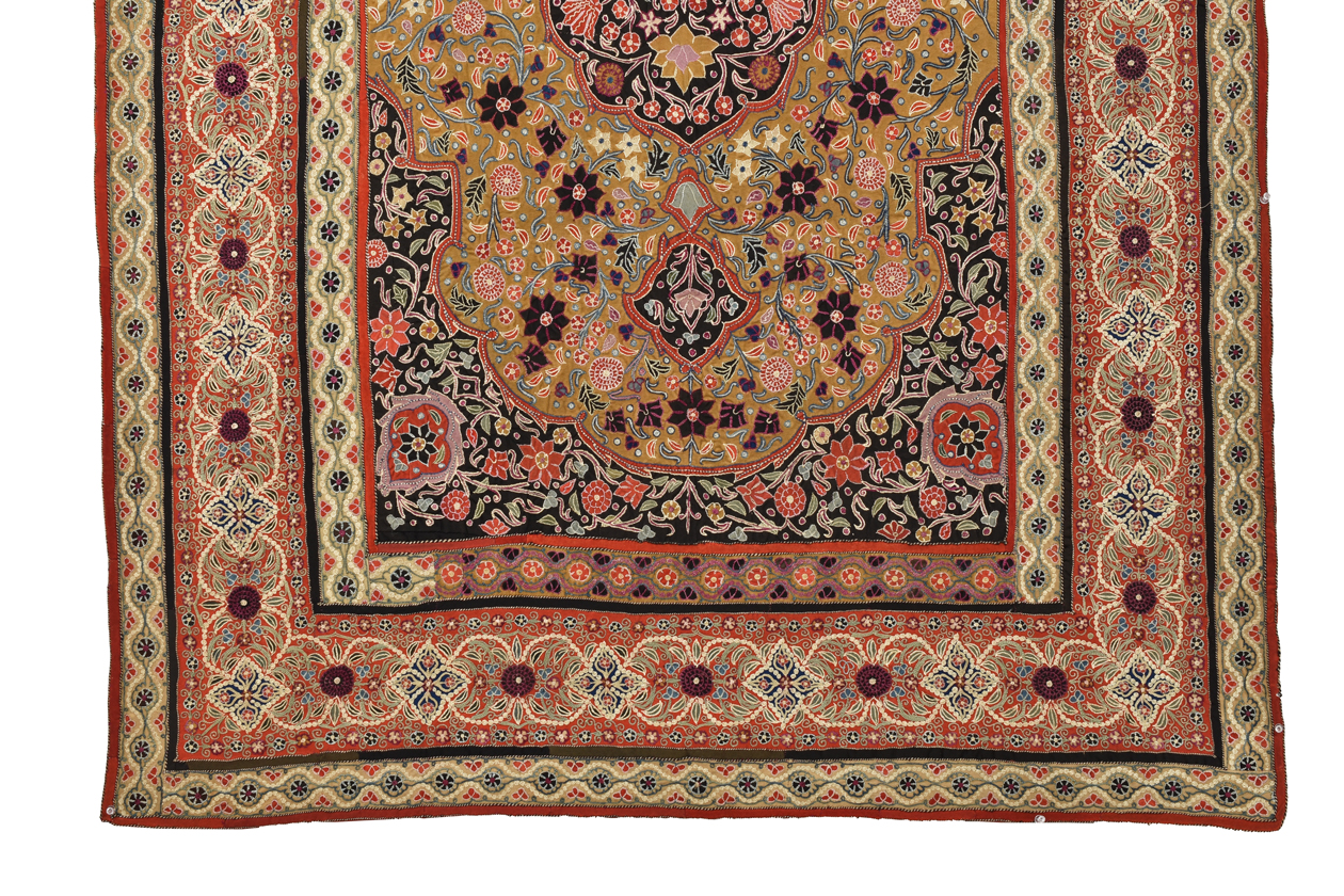 This fine example of Persian Resht embroidery shows a large central floral design with three borders. The patchwork design is made mainly with chain stitch silk