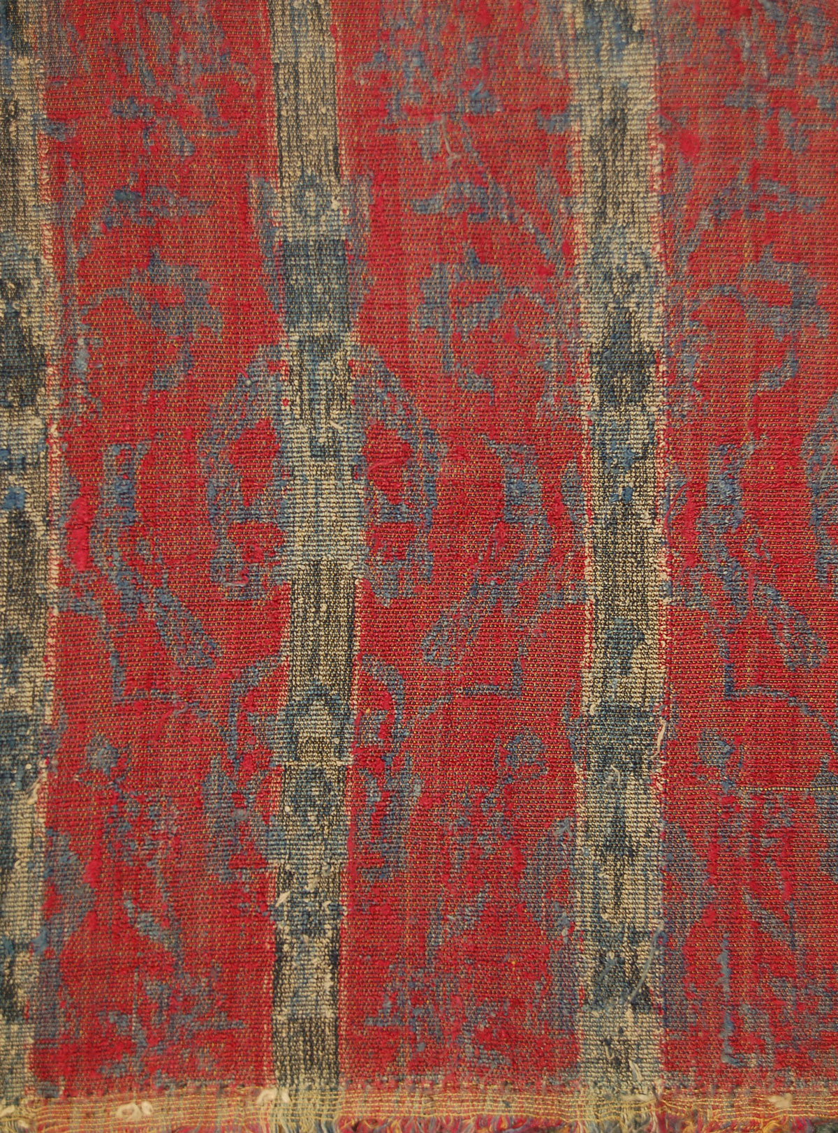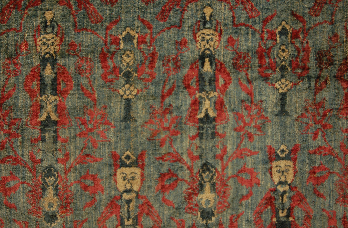 This Safavid-style PersianĀ velvet fragment was made in theĀ 19th century or earlier. It features a repeating solider or sultan with a floral and urn motif in red, blue, and black short repeat and emulates Safavid velvet designs. Velvet would have been a symbol of luxury, and was likely used as a floor spread or furnishing fragment.