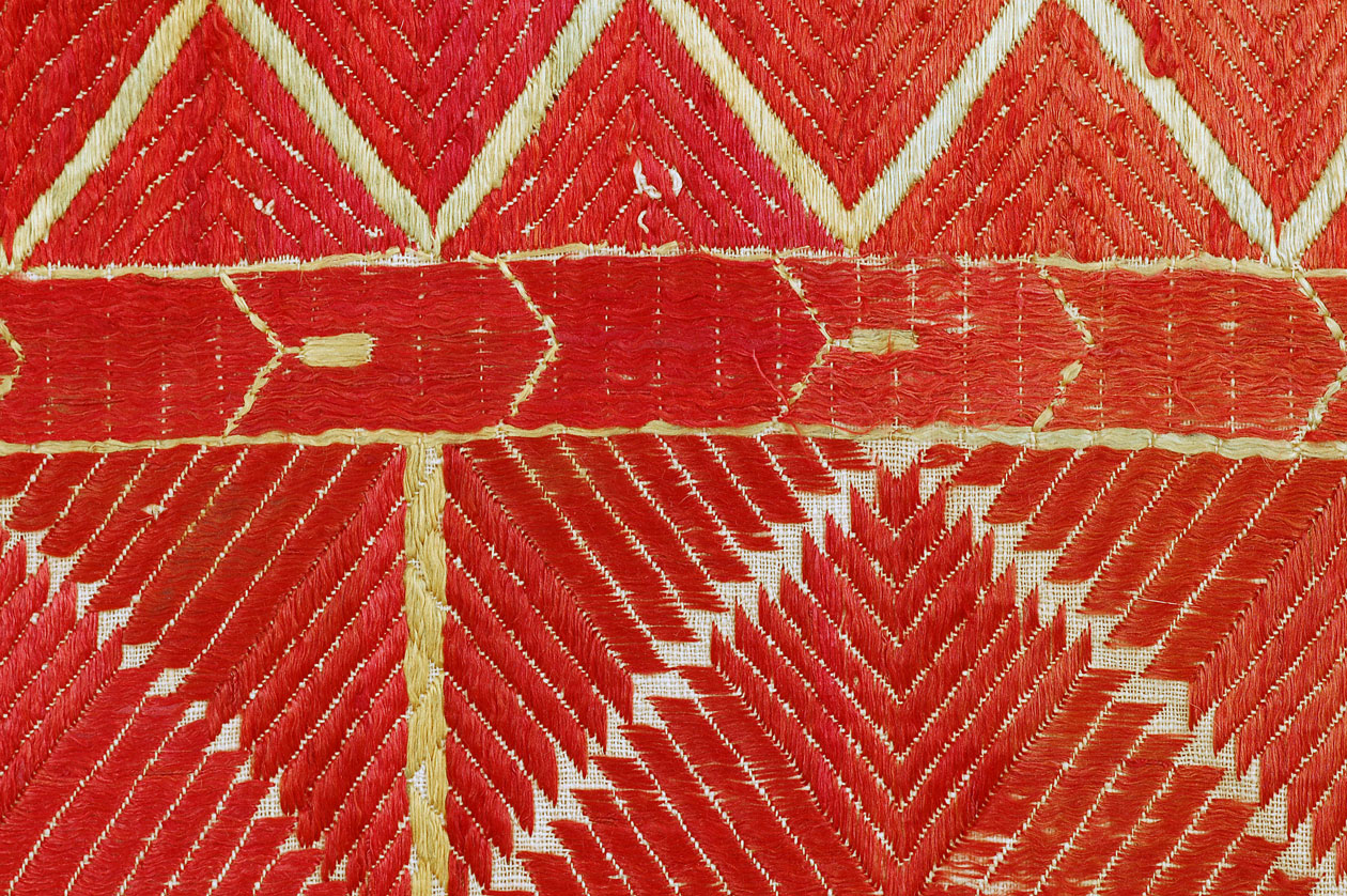 This phulkari with abstracted flowers was made in India in the 19th century. The maker used red silk to embroider a pattern of abstract flowers on an off-white cotton base textile. These flowers are bordered by several registers of triangles, arrows, and squares, also in red silk. The maker embellished the flowers with a touch of green silk, which adds a layer of visual complexity to the work.