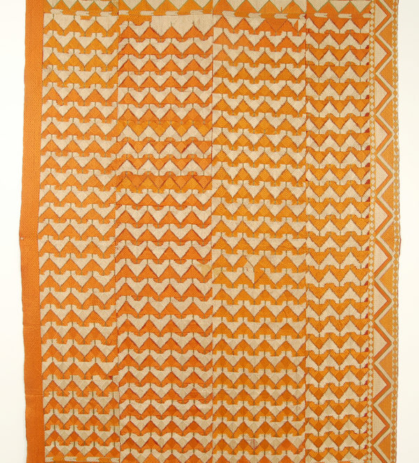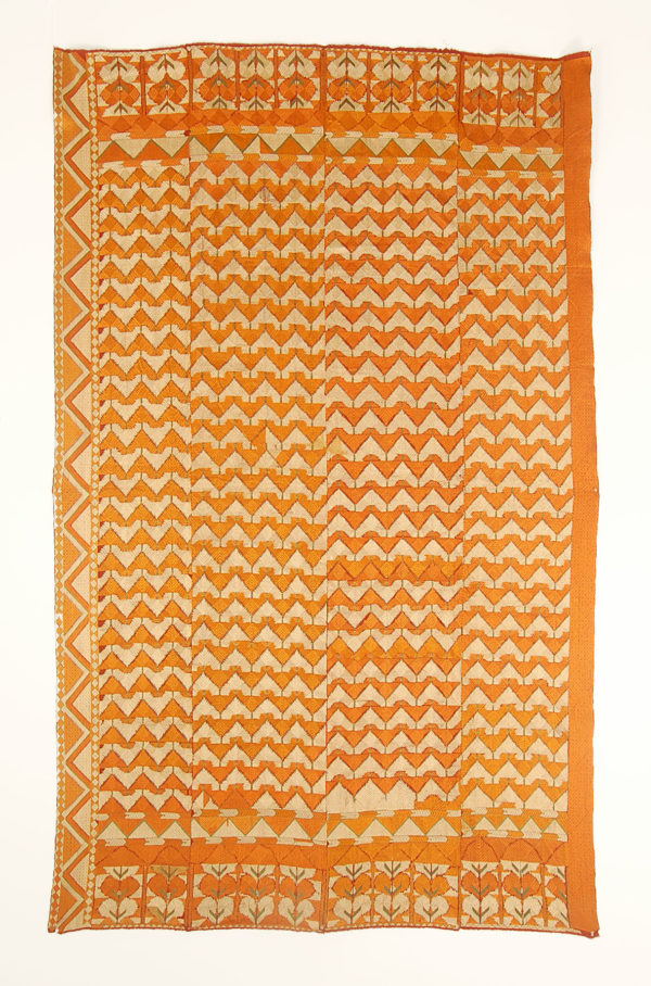 This phulkari was made using a deep red-brown ground fabric and orange, white, and green silk thread. Most of the design is made up of repeating interlocking triangles, but the border is decorated with leaf shapes, diamonds, and large stand-alone triangles.