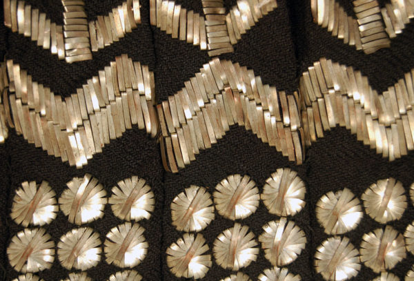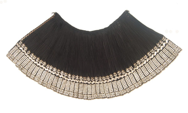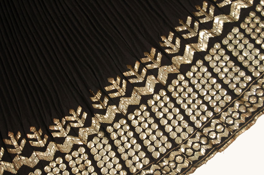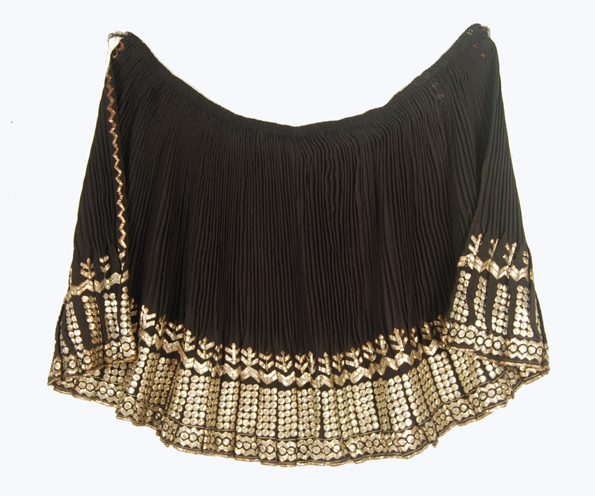 Skirt composed of two woven wool panels that are stitched together lengthwise, then pleated and finally ornamented with silver ribbon embroidery in an abstracted floral design. The origin is the Mehenditi region in the Oltenia province of Rumania. It is worn on festive occasions together with either a blouse similarly decorated or with a white peasant blouse embroidered in polychrome silk. You would expect this combination to be garish but somehow it all works well.Please see images form books illustrating both.