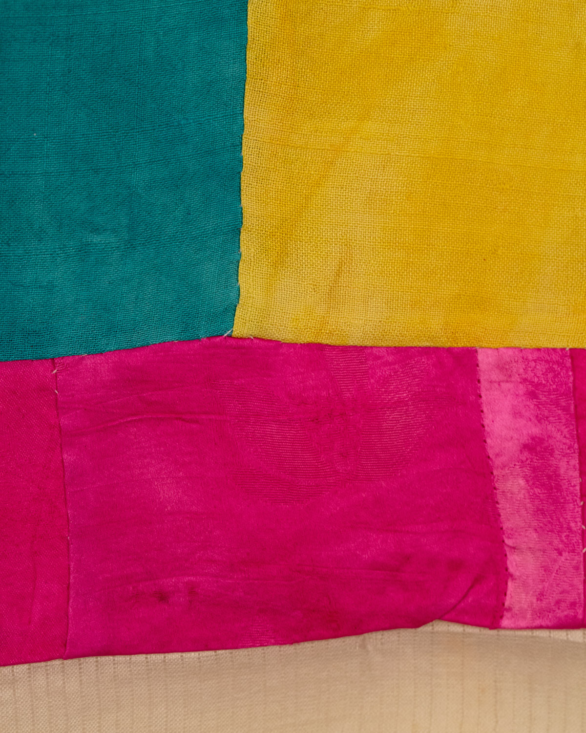 This typically square form pojagi is made of a patchwork of colorful fabrics sewn together. The checkerboard design features several hues of magenta, blue, and yellow. The magenta squares are damask, two toned floral. All enclosed within two borders, the inner magenta and the outer white. Interestingly abstraction in Korean wrappings was in place long before western artists embraced abstract concepts in art.