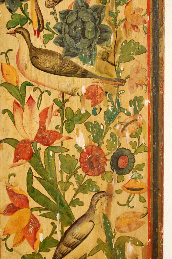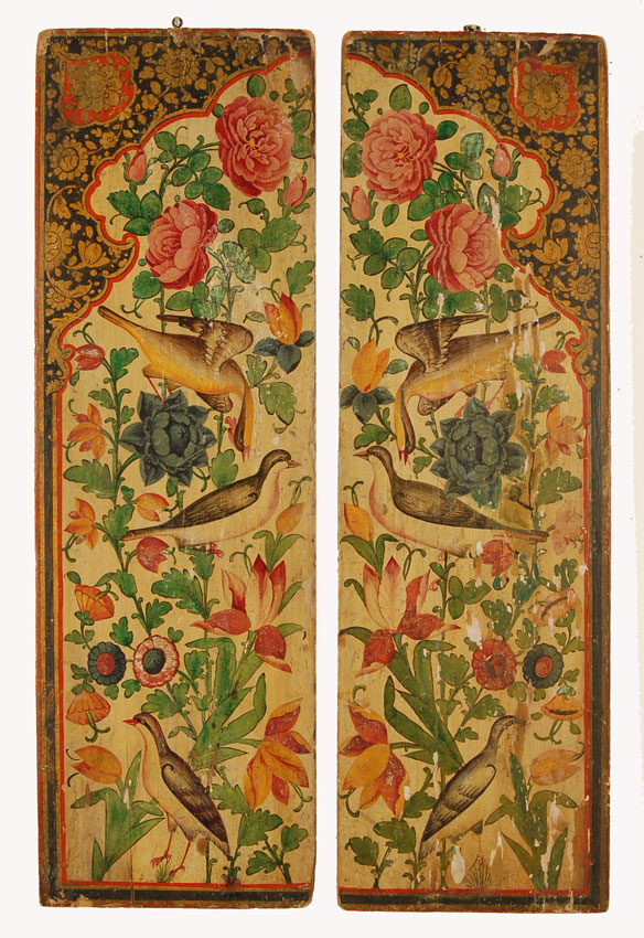 These Qajar window shutters were made in Persia in the 19th century. These wooden shutters are lacquered and colorfully painted on the front and back with birds and flowers. One side has a prayer arch border while the other is bordered by a double arch. These borders are filled with meandering vines. These shutters are mounted on a metal stand.