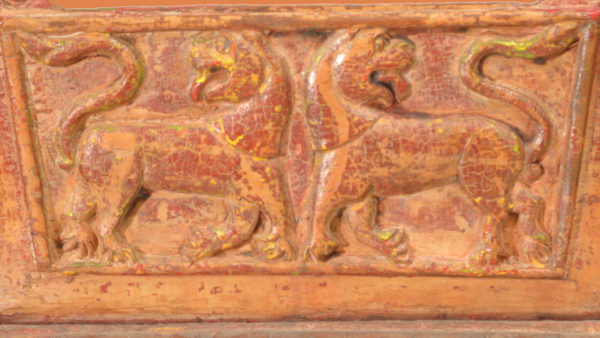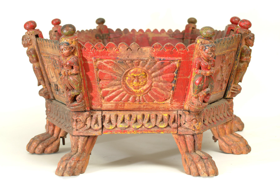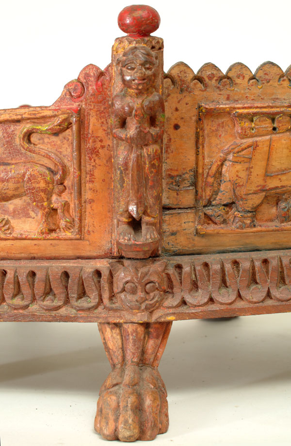 This Rajastani bassinet or table was made in the 19th century. It is made out of carved wood, iron, and cane-work. This bassinet is decorated with ornately carved side panels that depict lions, elephants, and solar-scapes set amid columns of guardians and dancers; all set on eight clawed feet. Some of the paint has been rubbed off of the wood and the cane-work has been replaced, but the overall condition is good.