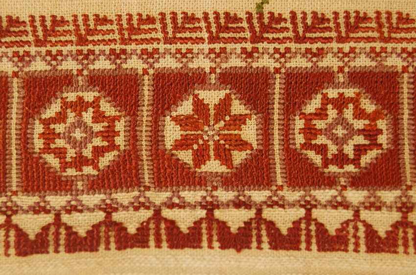 Shawl or veil made of two joined panels of linen and embroidered in red and green colied silk using a counted cross stitch. The center field is decorated in a grid scheme with European motifs of rooster, hens, urns and flowers.The two long edges have a border containing stylized flowers also in European style while the two ends are covered with embroidery of almost solid blocks in the “tall palm”pattern, a distinctive characteristic of Ramallah dresses. A dikkeh band with silk fringe is attached at each end.