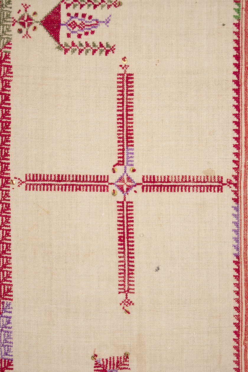 Coiled, mostly red silk thread embroidered in cross stitch, worked on two linen panels sewn together lengthwise. The color red was the second most commonly used color for Palestinian ceremonial garments after indigo. Embroidery threads were dyed red using madder and cochineal.