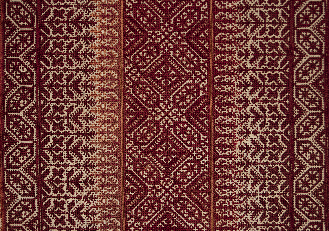 The design and style of Fez embroidery, like many other Moroccan embroideries, show Hispano-Moresque influence. The design elements are abstracted florals and geometrics. It is almost always monochromatic and reversible. The handwork is executed in a counted stitch technique such as reversible double running stitch, stem stitch or back stitch. The embroidery is done with tightly coiled silk on heavy cotton as in this textile.