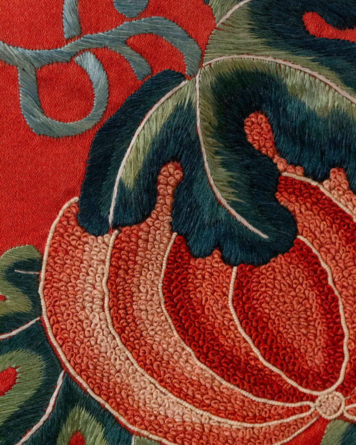 Red panel comprised of two lengths of red silk. It is decorated in scatter design with peaches, pomegranates, pumpkins, orchids, peonies, chrysanthemums, bats, and butterflies. The artist used polychromatic silk in mostly satin and Peking knot/forbidden stitches.