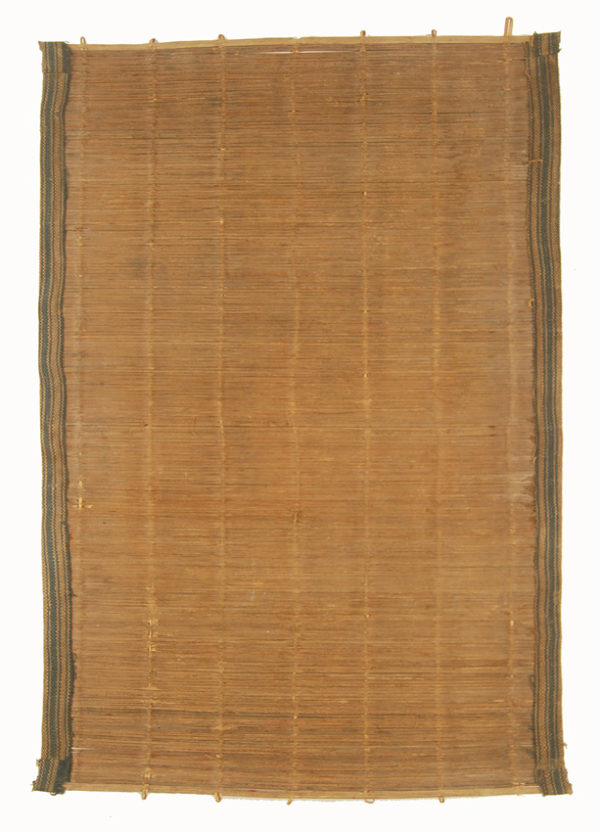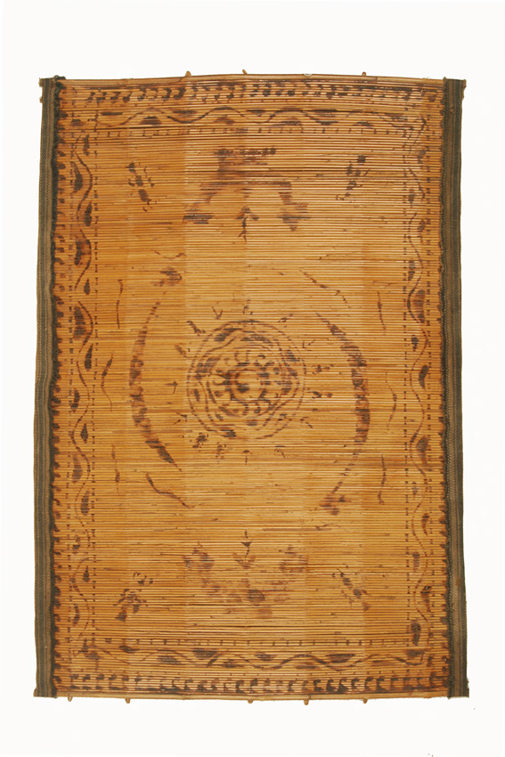 When travelling and visiting homes in the villages of the highland of west Lampong, Sumatra, the hosts will always roll out a large bamboo mat for their guests, but a lampit is a type of mat used only on importand occasions. Limpits were prominent in circumcisions, weddings and funerals. Made and decorated by men, they are usually paired with tampans, the ship cloths made by women, to express the principles of male/female duality.The images etched onto the bamboo with smoldering ambers, with two lateral edges hemmed with cotton.