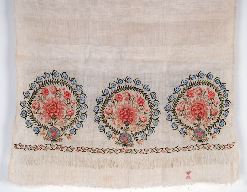 Large linen towel used for ritual occasions. The center is loosely woven to produced absorbent terrycloth while each end is embroidered with three rondels formed by garlands of blue flowers containing a field of orange pink flowers., all done with polychrome silk and metallic thread in a variety of stitching techniques.The exemplary handwork results in double faced towel of subtle beauty.