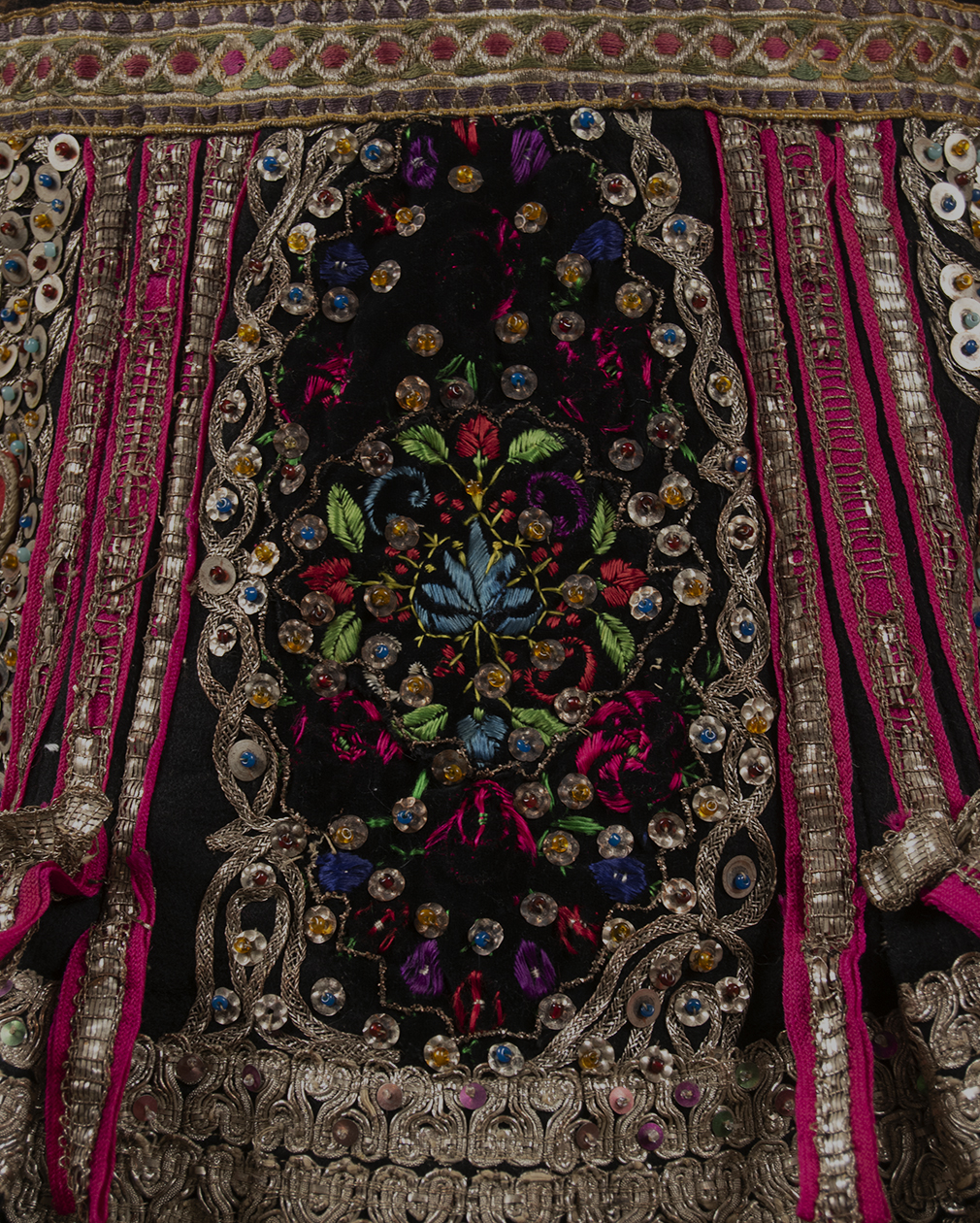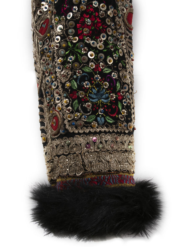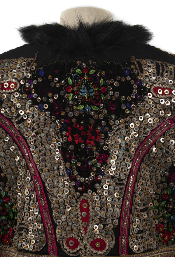 Material: Wool with silk embroidery, metallic thread, sequins, faux fur, and glass beads