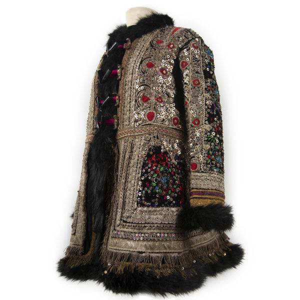This unique and dazzling coat is made of wool with metallic embroidery, silk embroidered applique, metallic fringe and sequins. The interior lining is cotton, and the edges and sleeves were once lined with rabbit fur in poor condition. It is now faux fur and can be closed using hidden hooks or four toggles.