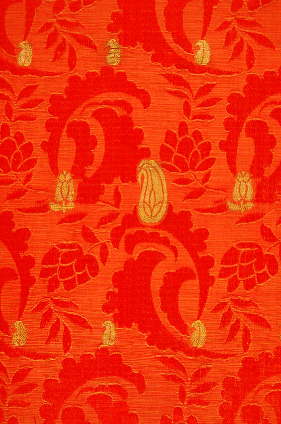 Cope of tomato red- orange color. The damask ground features a two toned floral design which is overlayed with gold brocading done in discontinuous supplementary weave. The brocading features rows of small paisleys and flowers.