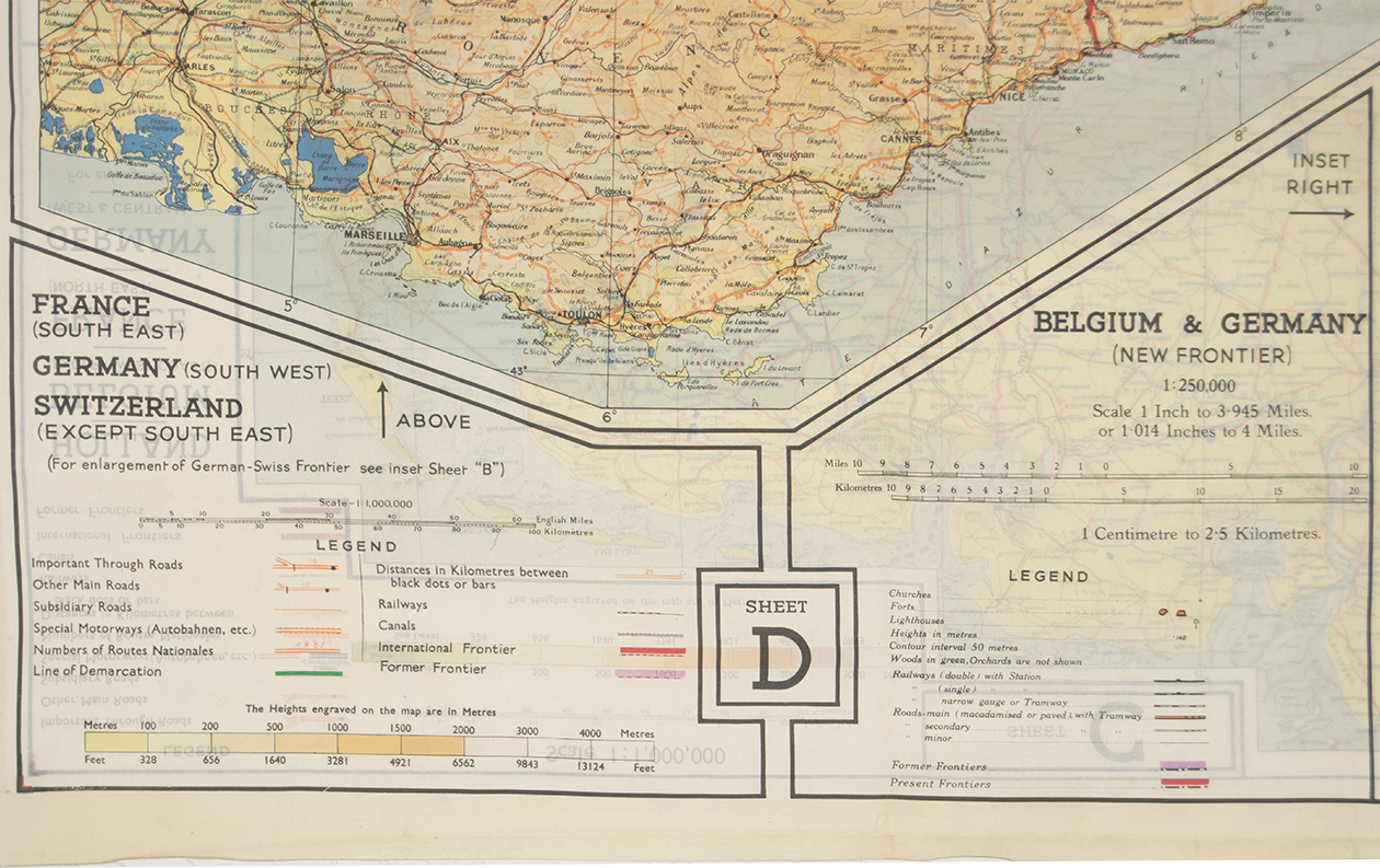 This silk escape and evasion map was made in the 1943 by the British Royal Air Force and features Holland, Belgium, France, Germany, France, and Switzerland. These maps are identified by their bright colors as being printed by the company of John Waddington, Ltd. Silk maps were originally developed during World War II to help British soldiers escape enemy territory or POW camps, and continued to be produced after the War ended in both Great Britain and the U.S.