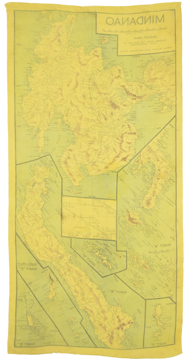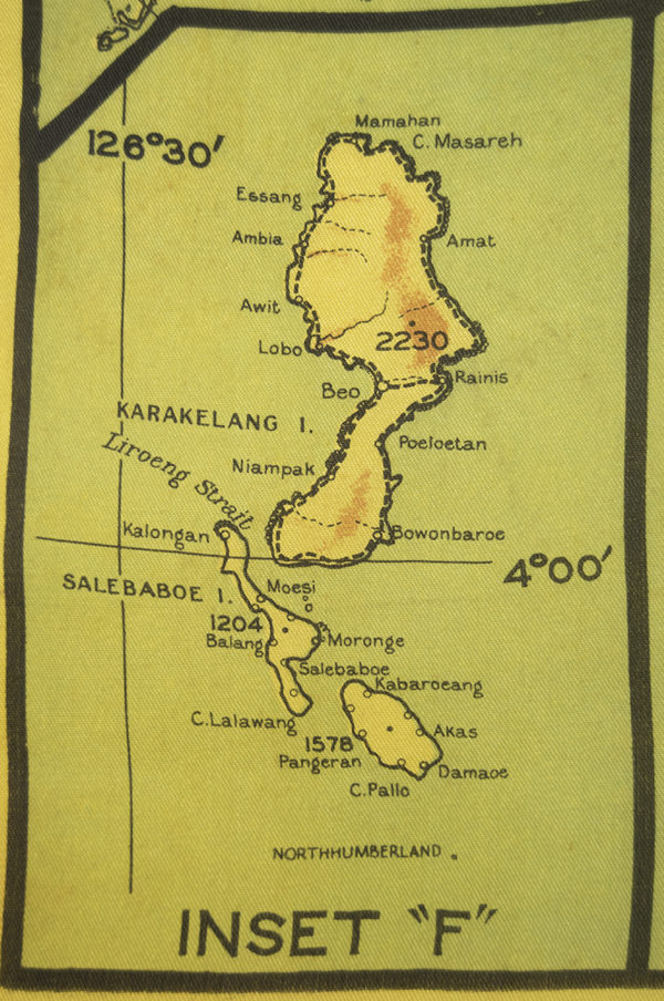 This map is single sided and highlights Mindanao, Celebes (Indonesia), and the surrounding islands. The tightly woven silk allows for clear prints and small details.