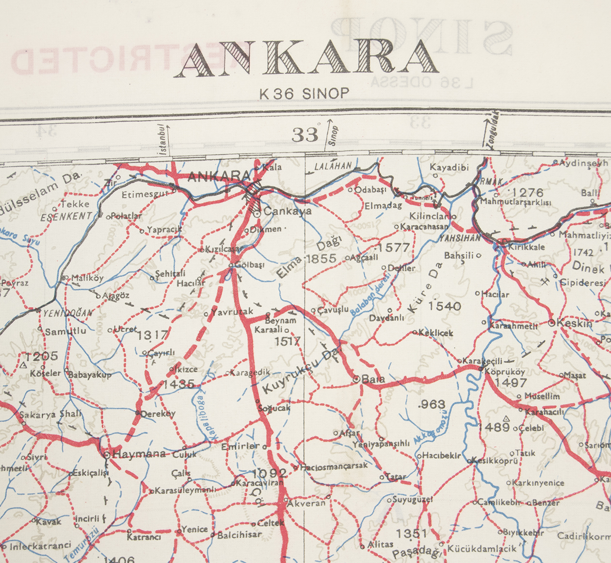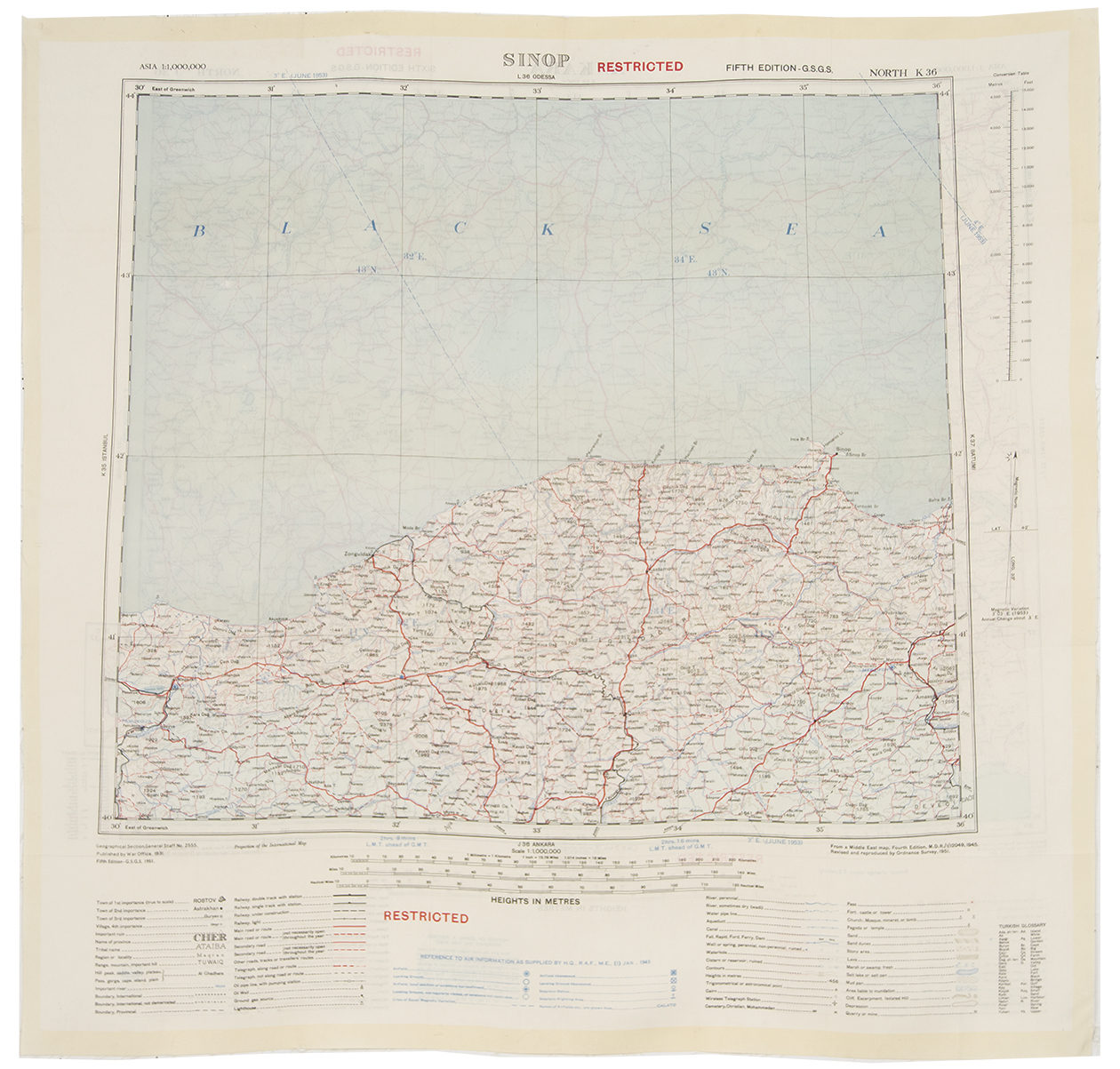 This silk escape and evasion map was made in 1951 by the Geographical Section General Staff (G.S.G.S.) in Great Britain and features Turkey. Silk maps were originally developed during World War II to help British soldiers escape enemy territory or POW camps, and continued to be produced after the War ended in both Great Britain and the U.S.