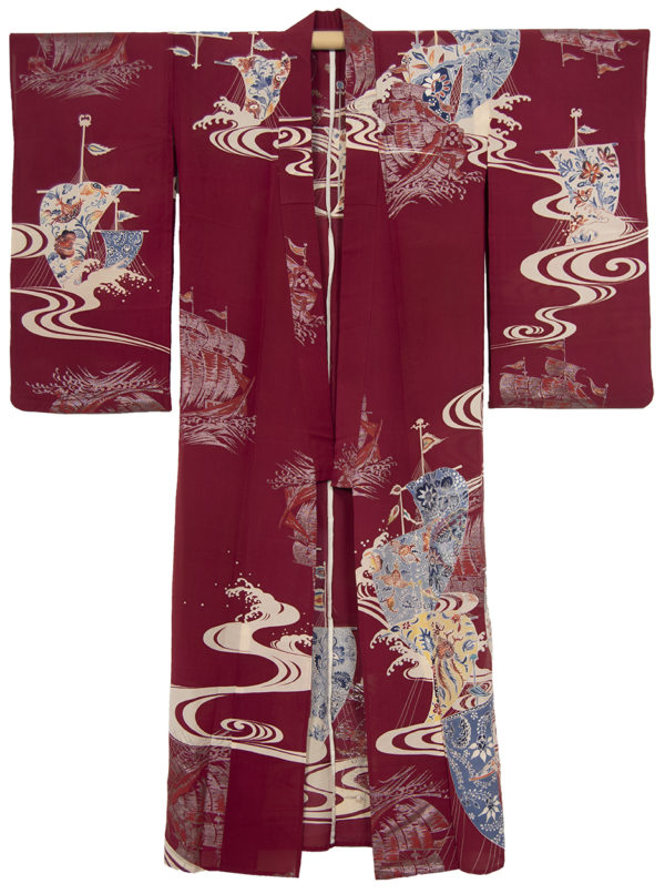 A furisode is a kimono that is characterized by its long, fluttering sleeves and would be worn by a young, unmarried woman. This maroon, silk furisode kimono is decorated with sailboats with  the sails providing the ground for the floral motifs.