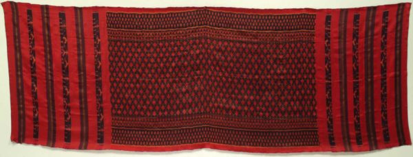 Silk sarong done in the ikat technique in which the threads get tie-dyed before they get woven.Cambodian ikats are done on twill silk with the ikat done on the weft, the patterns are small and bordered.They are used as costumes in religious ceremonial dances