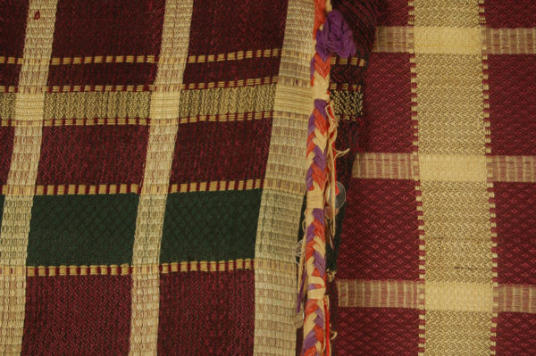 Patterned silk shawl with a grid design in purple, green and yellow.With attached tassels and sequins. The loose, see through weave suggests its usage as a veil.