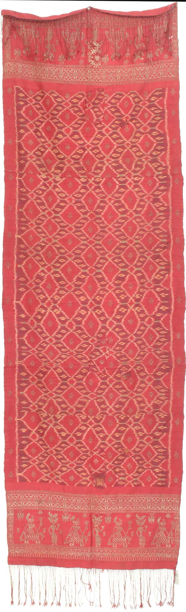A silk shoulder cloth with a field of weft ikat design framed at bottom and top by two bands of supplementary metallic thread weave featuring dancing figures.