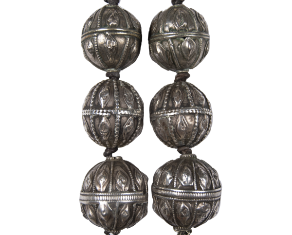 Yemeni artisans sourced silver from imported Maria Theresa coins, which were used for both currency and to be melted down for jewelry. The large silver beads are called “qahhat,” and are a common shape seen on these pieces. This necklace is mostly silver beads, chains, and dangling ornaments with four strands of small to medium coral beads.