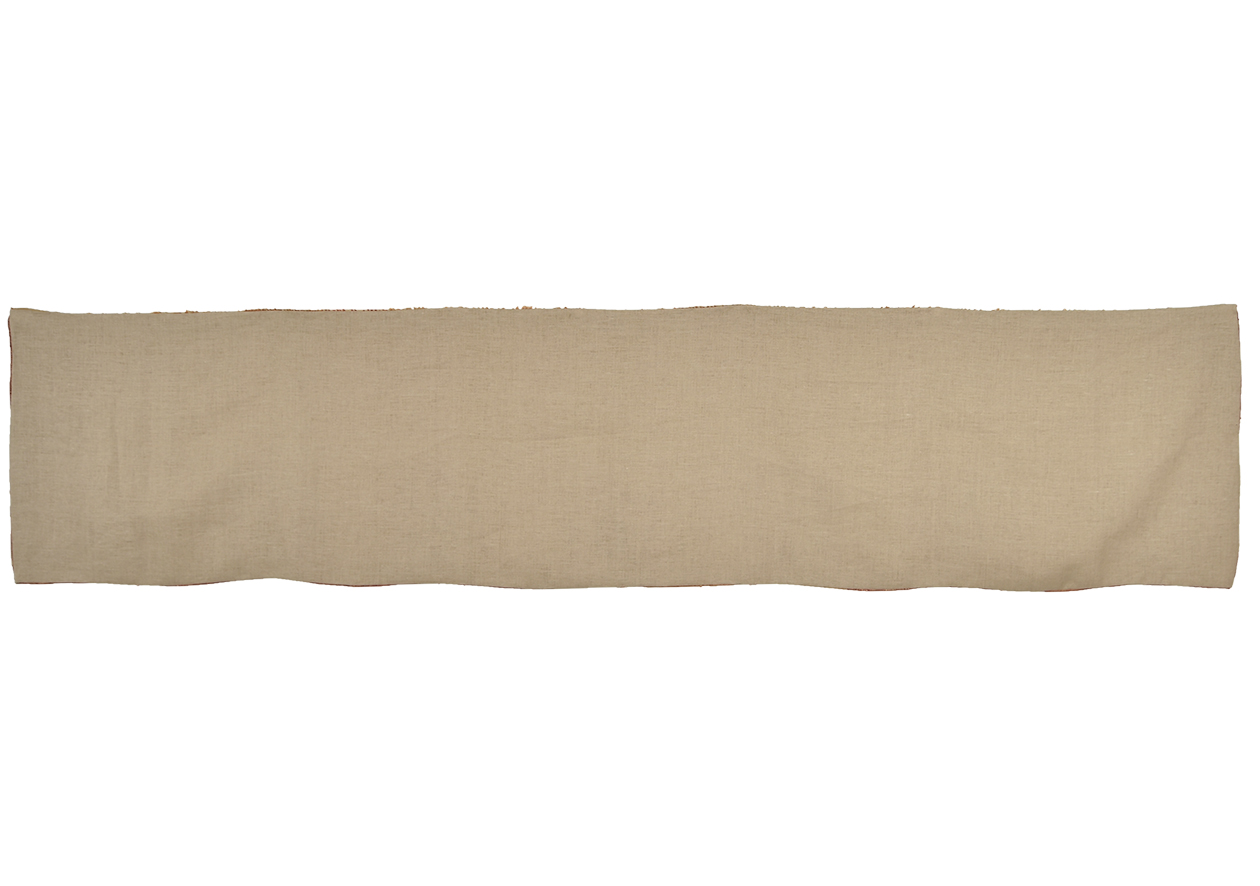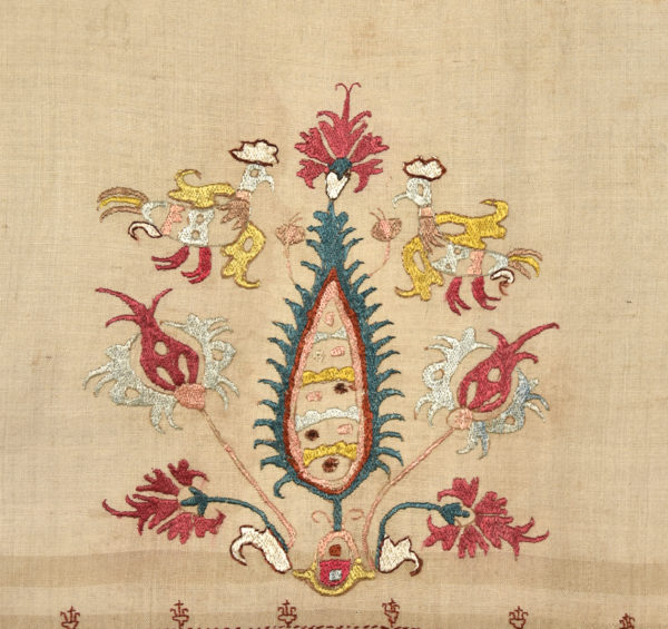 This long panel is not a valance but rather a panel of a coverlet or sheet. Originally these textiles combined three selvedged long panels sewn together lengthwise. The decoration is along the edges so that the center panel would have embroidery only at the two short edges. Rows of medallions with a center vase with flowers, with pair of birds flanking each vase. There are three styles of birds, the largest of which are cockerels with large tails and crests.