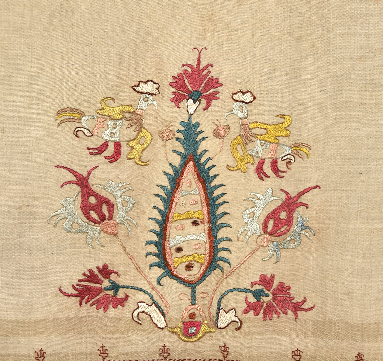 Skyros, in the North Aegean sea, is the largest of the Sporades islands and the only one of them with its own unique embroidery style. Skyros embroideries use naturalistic elements such as musicians, horsemen with raised swords, birds and ships, all drawn freehand and embroidered with very colorful floss silk. One unique element is the cockerel. Many elaborate versions of it are found in local work, where it was used as a secret symbol of independence and resistance to Ottoman rule.