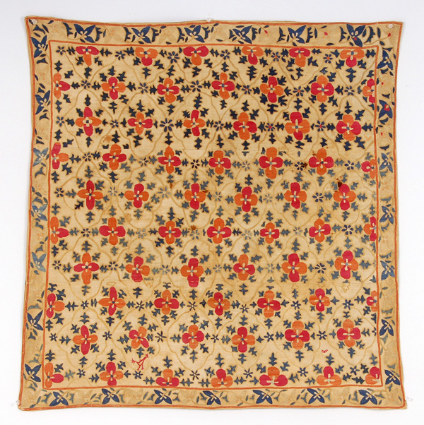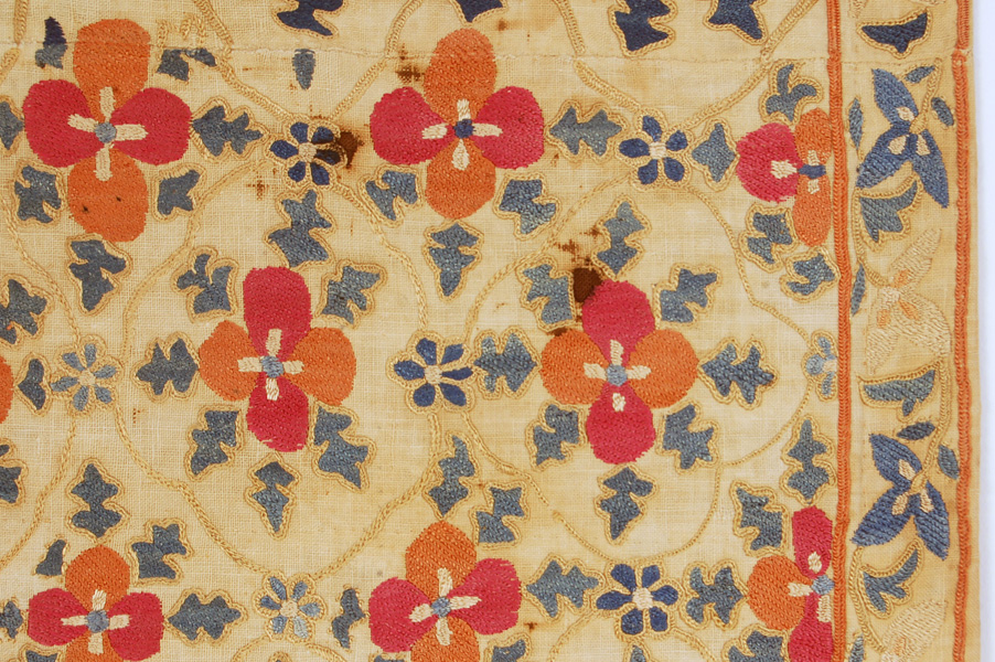 3Three joined cotton panels embroidered with beautifully shaded silk into a grid design of enclosed four leaf salmon and mauve flowers .Narrow border of meandering vine with blue flowers.The embroidery done with couching stitch and chain stitch.