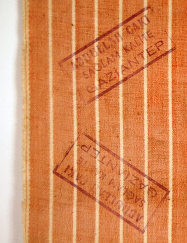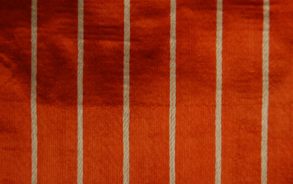 Yardage of tomato red satin with thin white vertical stripes. It is a glazed and stiff decorative furnishing material that was produced by a workshop identified by the stamp on the reverse. Workshop existed into the end of the first quarter of the 2oth century.