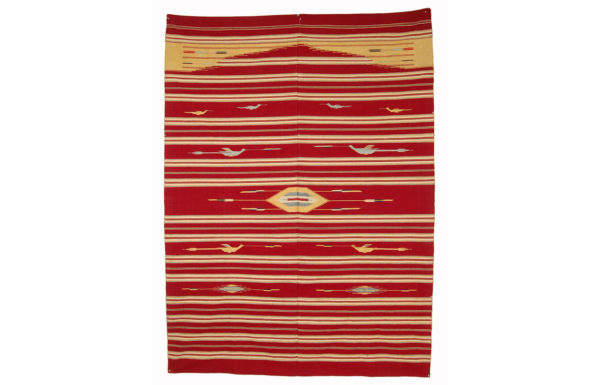 The decoration on this striped Syrian kilim is a bird, cloud, and arrow design. We have another similar example in the collection where two similarly patterned sections of zok are joined together oppositely, creating a slightly different kilim.