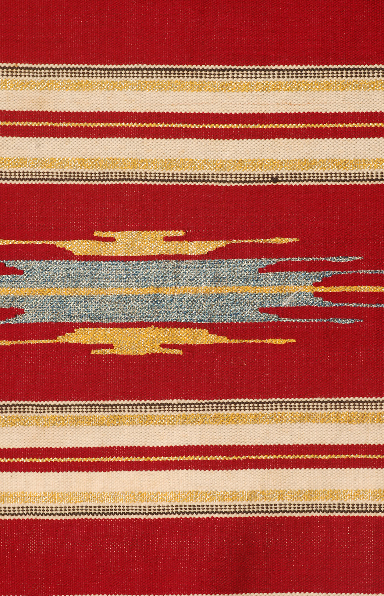 This striped Syrian kilim was made in the early 20th century out of cotton and metallic thread.