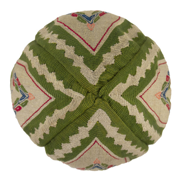 Zok is a slit tapestry technique reminiscent of flat weave rugs. It is weft face where the warp threads are hidden and the weft yarns discontinuous. Each color weft is interlaced back and forth in its own area. The distinguishing factor in the panels forming this hat is that the triangular shape is achieved by wrapping the weft over two or more warp threads. They are essentially panels with only one sided warp.