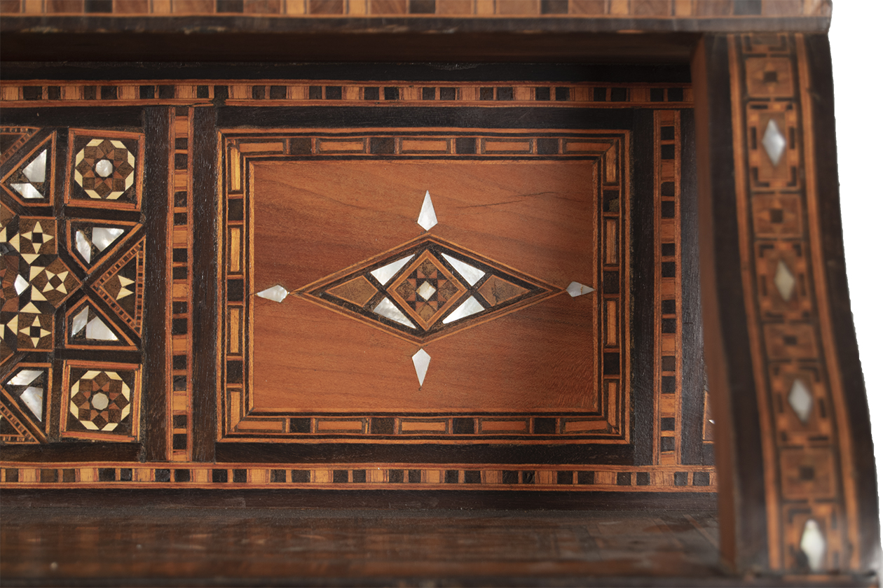 Marquetry wooden desk with a flip-up lid covering extra storage, as well as small drawers and an accompanying letterbox. This type of furniture, Western in design and structure but wholly covered with the traditional Islamic marquetry work, was made for export to Europe and sale in the Middle-Eastern bazaars to Westerners on the grand tour.