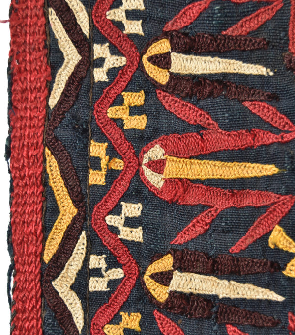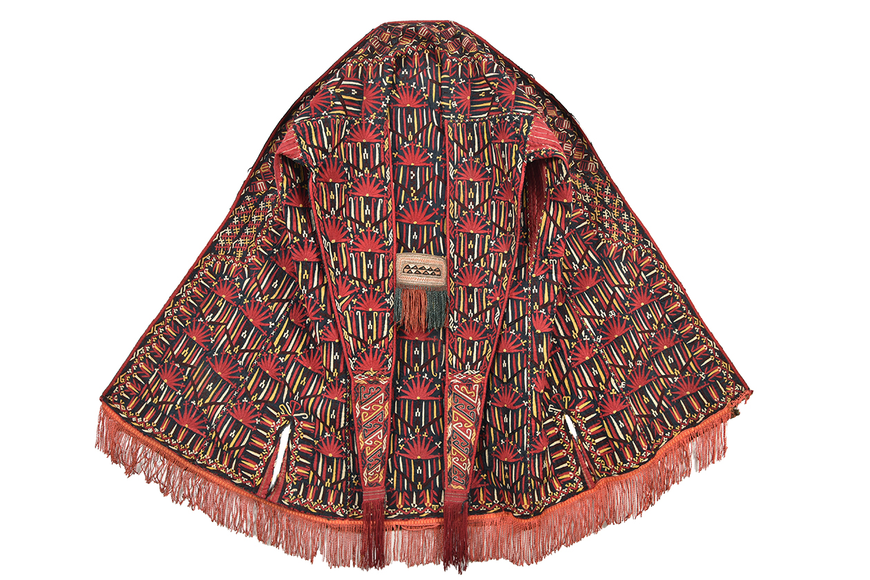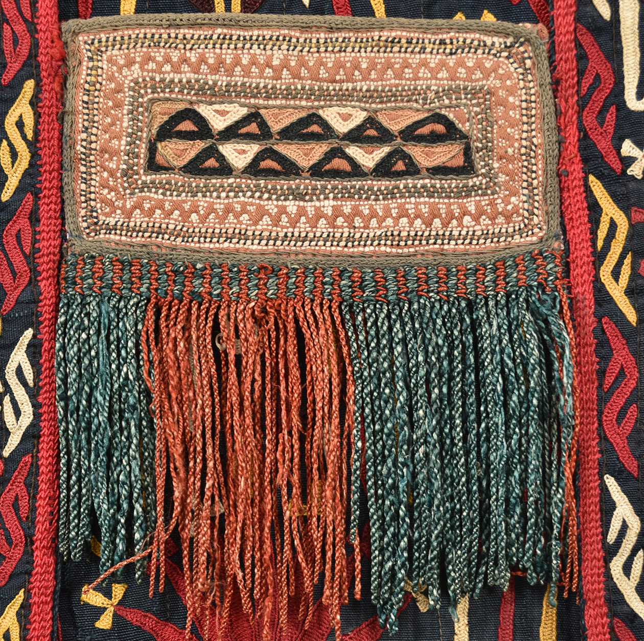 The Tekke are one of the many tribes inhabiting Turkmenistan. They used to be nomadic but now live mainly in urban areas. They are prolific embroiderers and their handwork is on lavish display on their women’s capes which are called chirpies. A chirpy can be worn over the shoulders as a cape or over the head. Their sleeves are usually vestigial and decorative. They drape over the back and connected with a small band. The color of the ground material is of great significance; young women wear blue chirpies, married woman wear yellow ones, and the rarest white chirpies are worn by matriarchs and widows.