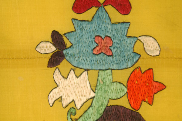 Urban embroideries of Morocco are easily categorized as each metropolis produced very distinct embroideries in both design and stitchwort. Tetouan, a large city on the Mediterranean coast , produced embroideries done in long satin stitch with designs that are free hand drawn and feature flowers with serrated edges. A wall hanging like this would be hung during wedding ceremony or other festivities.