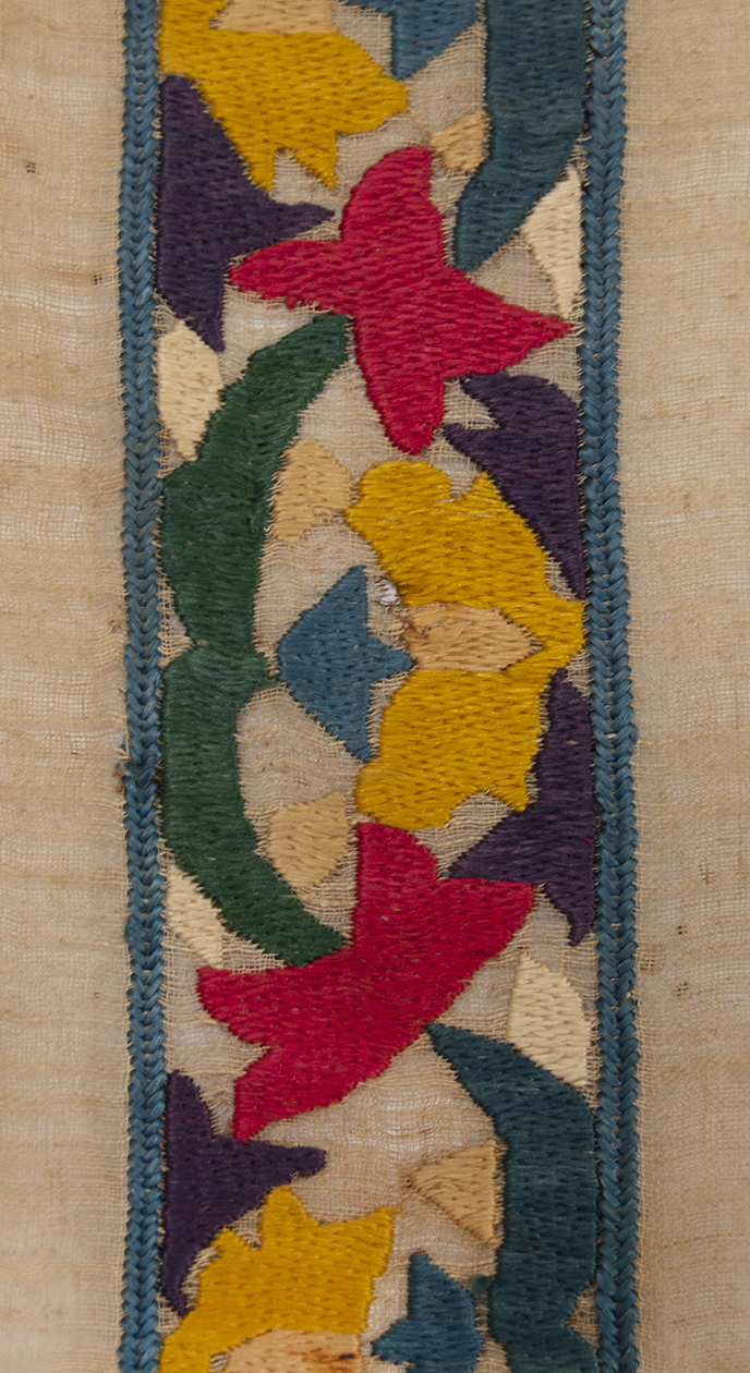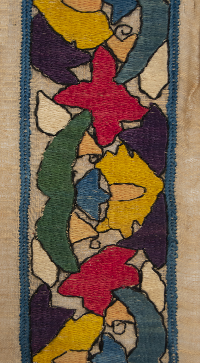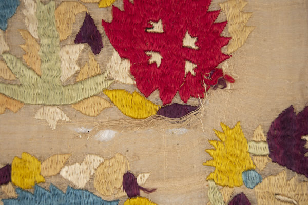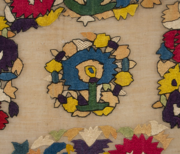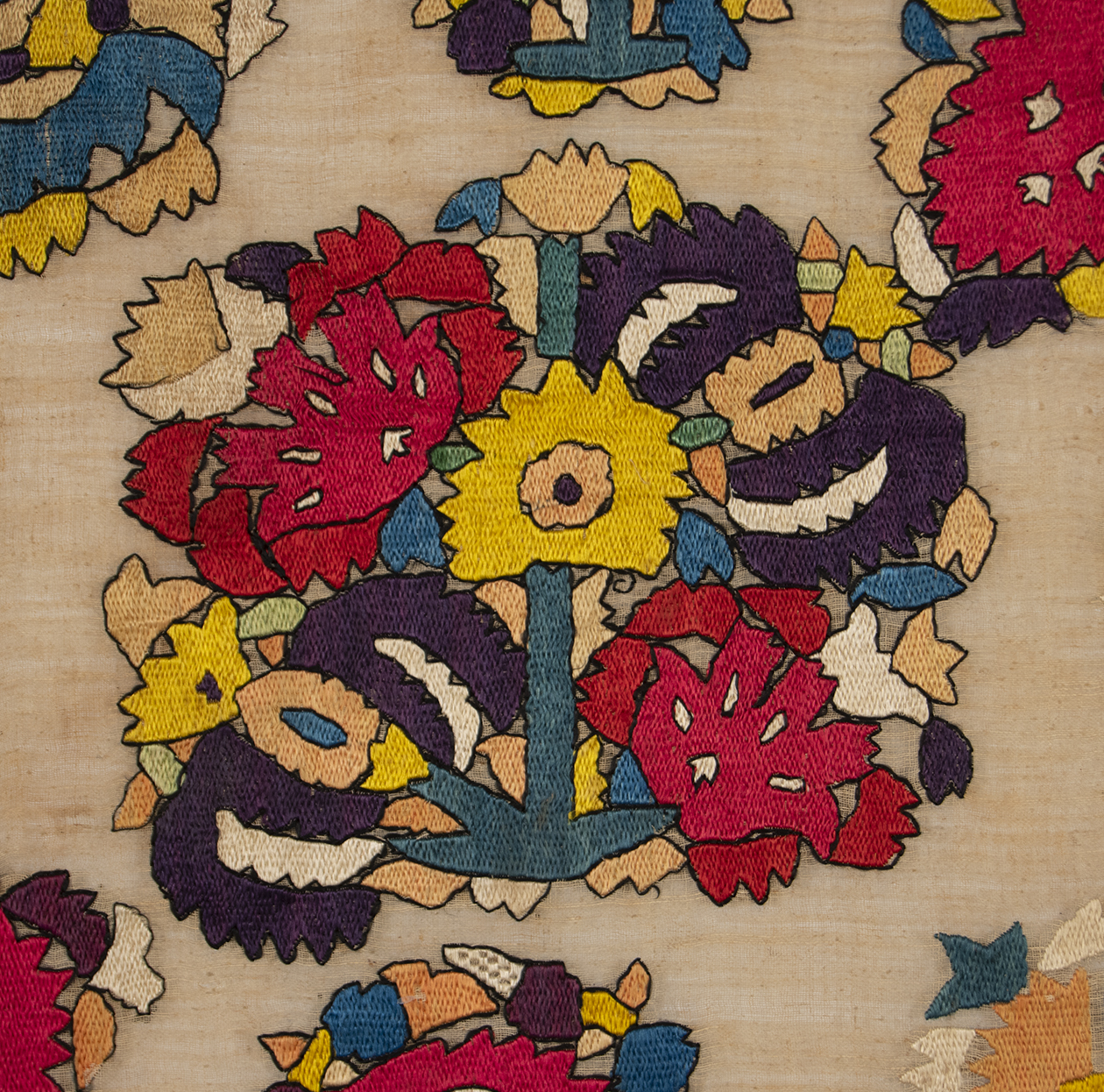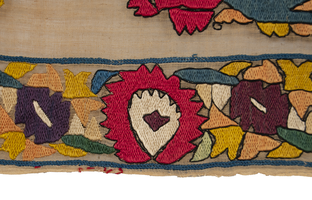 This piece , judging by the three borders, is a hanging or a furniture cover. It is densely embroidered with floral bouquets.The designs are executed from freehand drawings made directly on the fabric. The double sided embroidery technique is double running stitch, straight stitch, feather stitch and stem stitch, all in rich hued polychrome silk. The floral decorative elements are all framed in black silk. Style and technique resemble Turkish and Ottoman but have their own definitive style. Up until the late 18th century Tetouan handworks were made on un-dyed muslin or linen, like this piece, while later work is made on colorful silks or taffetas.