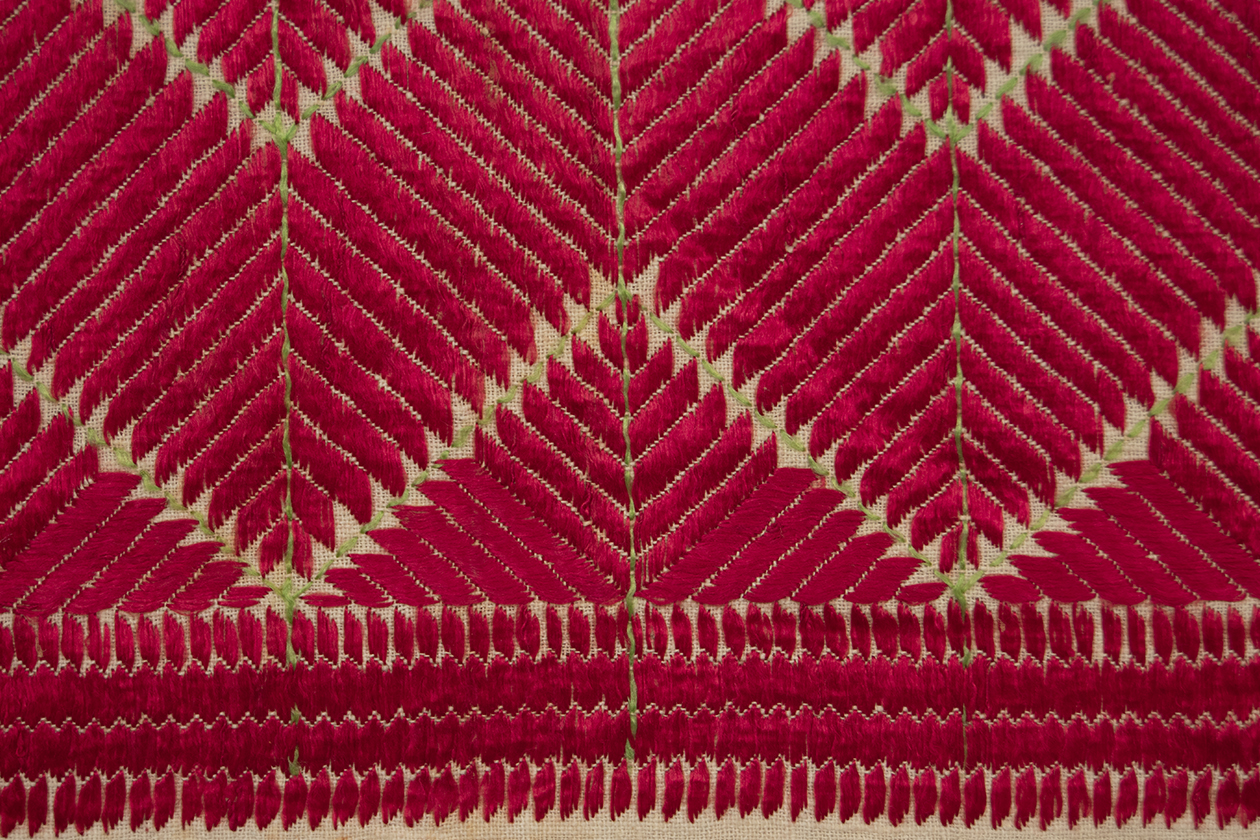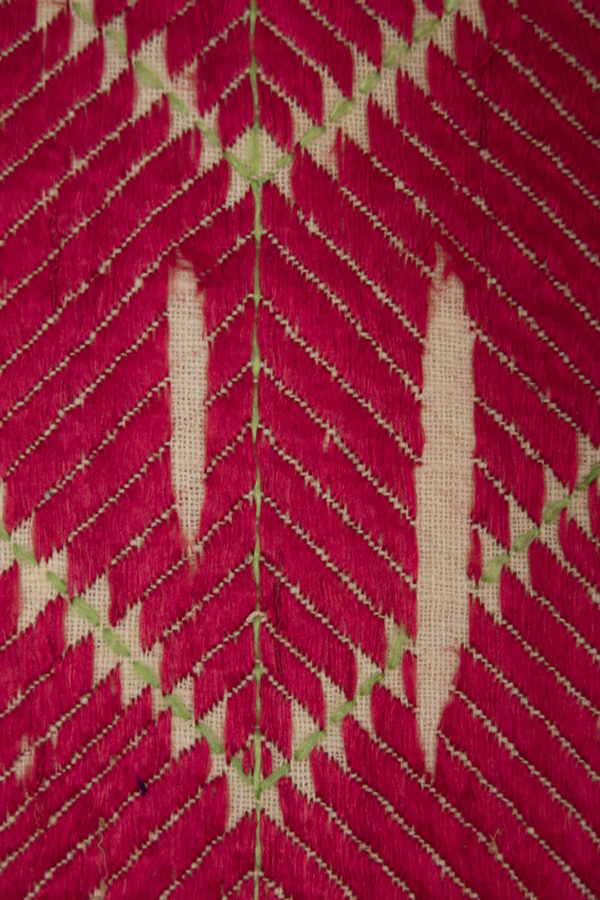 White-ground phulkari were popular in the 19th century, but in the 20th century embroiderers began to also use deep red-brown or blue ground fabrics that had been dyed with madder or indigo.