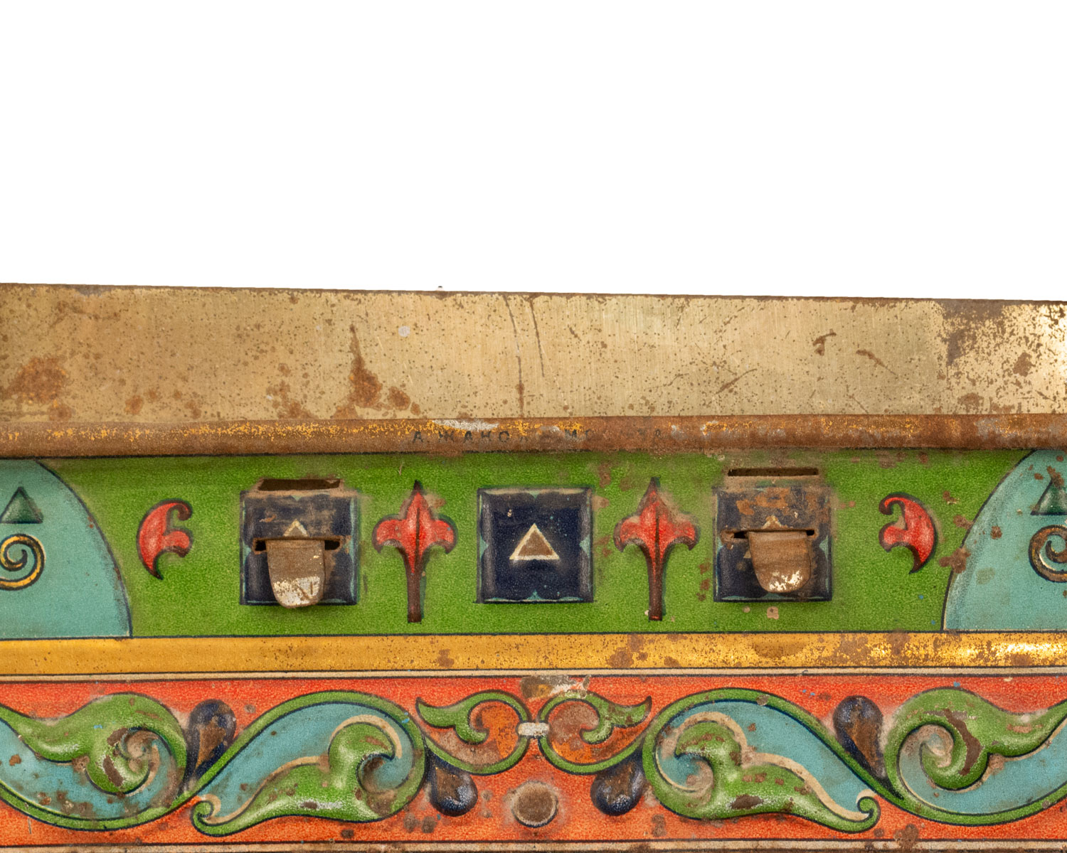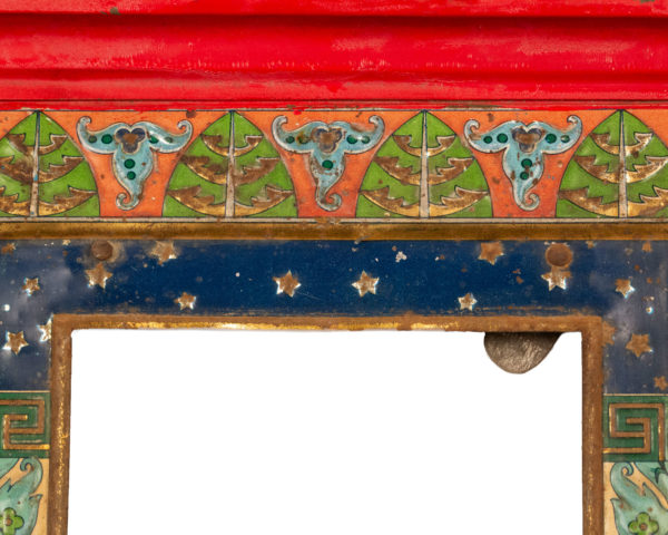 This piece is made from molded tin on a wooden base, and then enamel is applied before being baked. The design is a product of the Art Nouveau period, with flowing abstract florals and vines combined with geometric shapes. The style is similar to decorative windows at the time, so the artist could have been heavily influenced by Russian architecture.