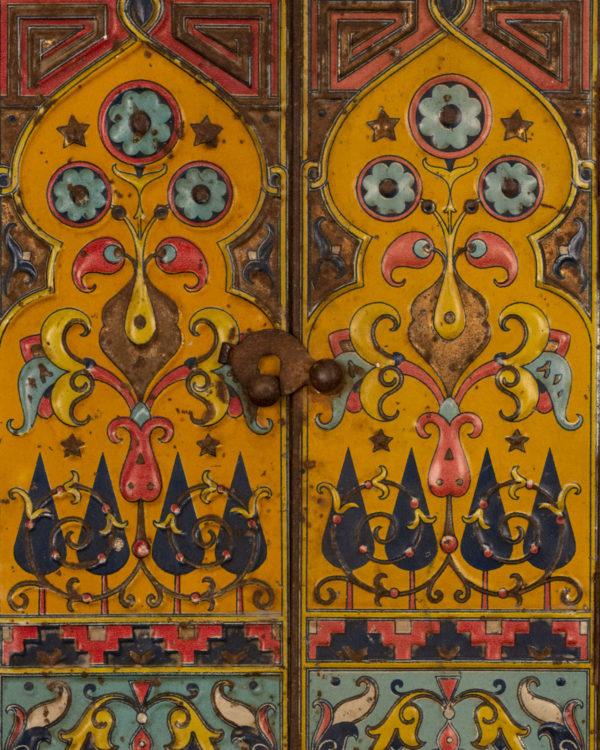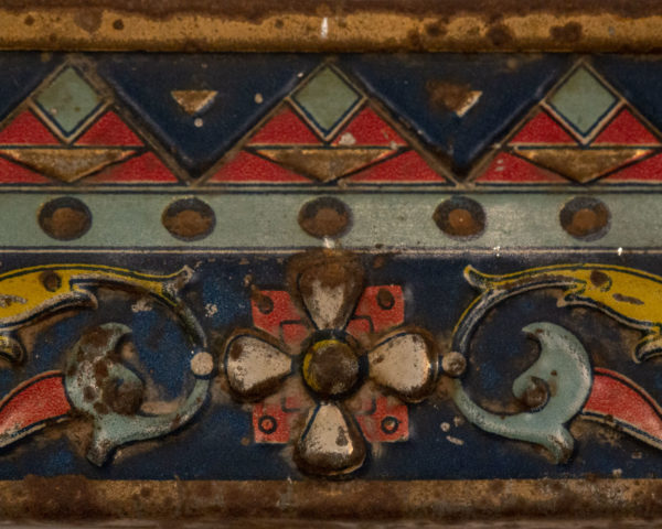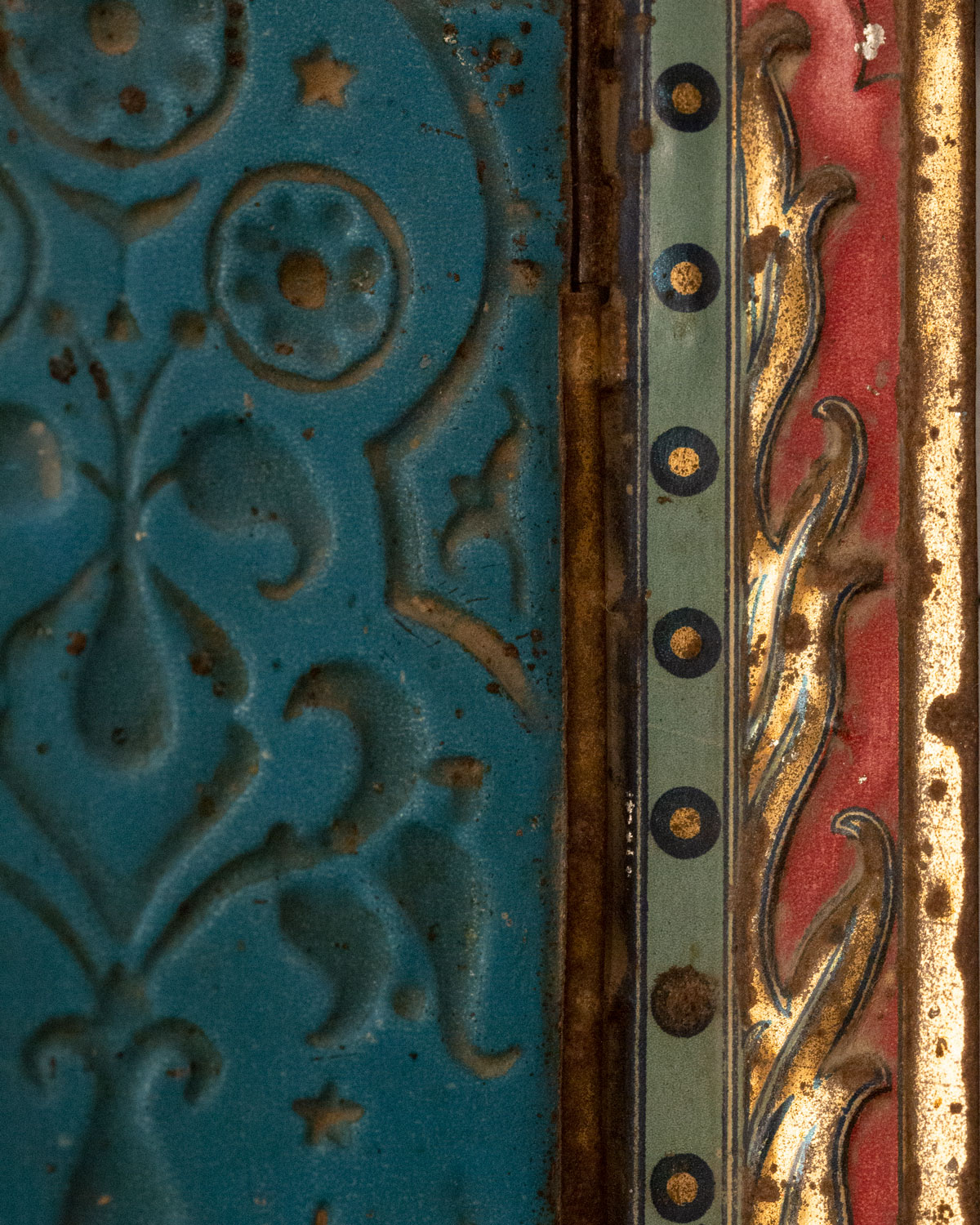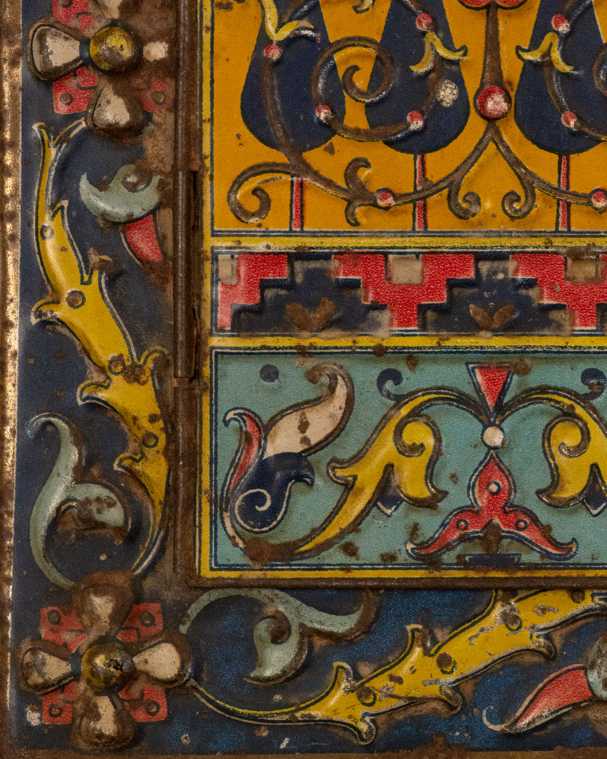 This piece is made from molded tin on a wooden base, and then paint is applied before being baked. The design is a product of the Art Nouveau period, with flowing abstract florals and vines combined with geometric shapes. The style is similar to decorative windows at the time, so the artist could have been heavily influenced by Russian architecture.