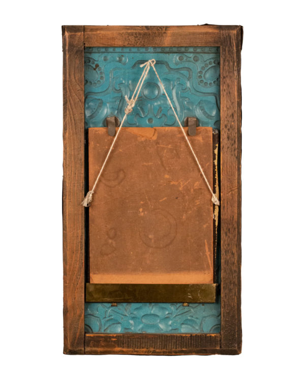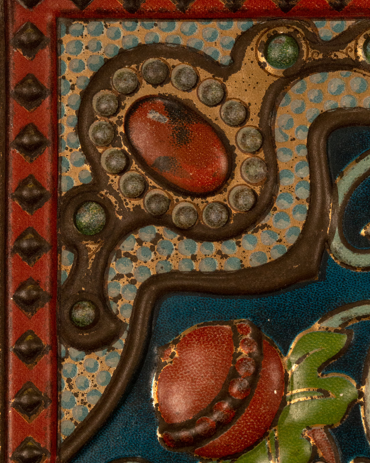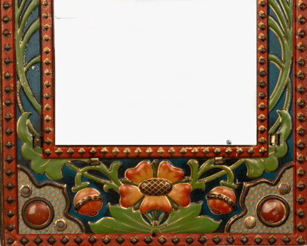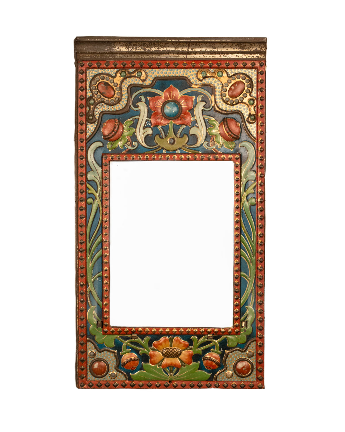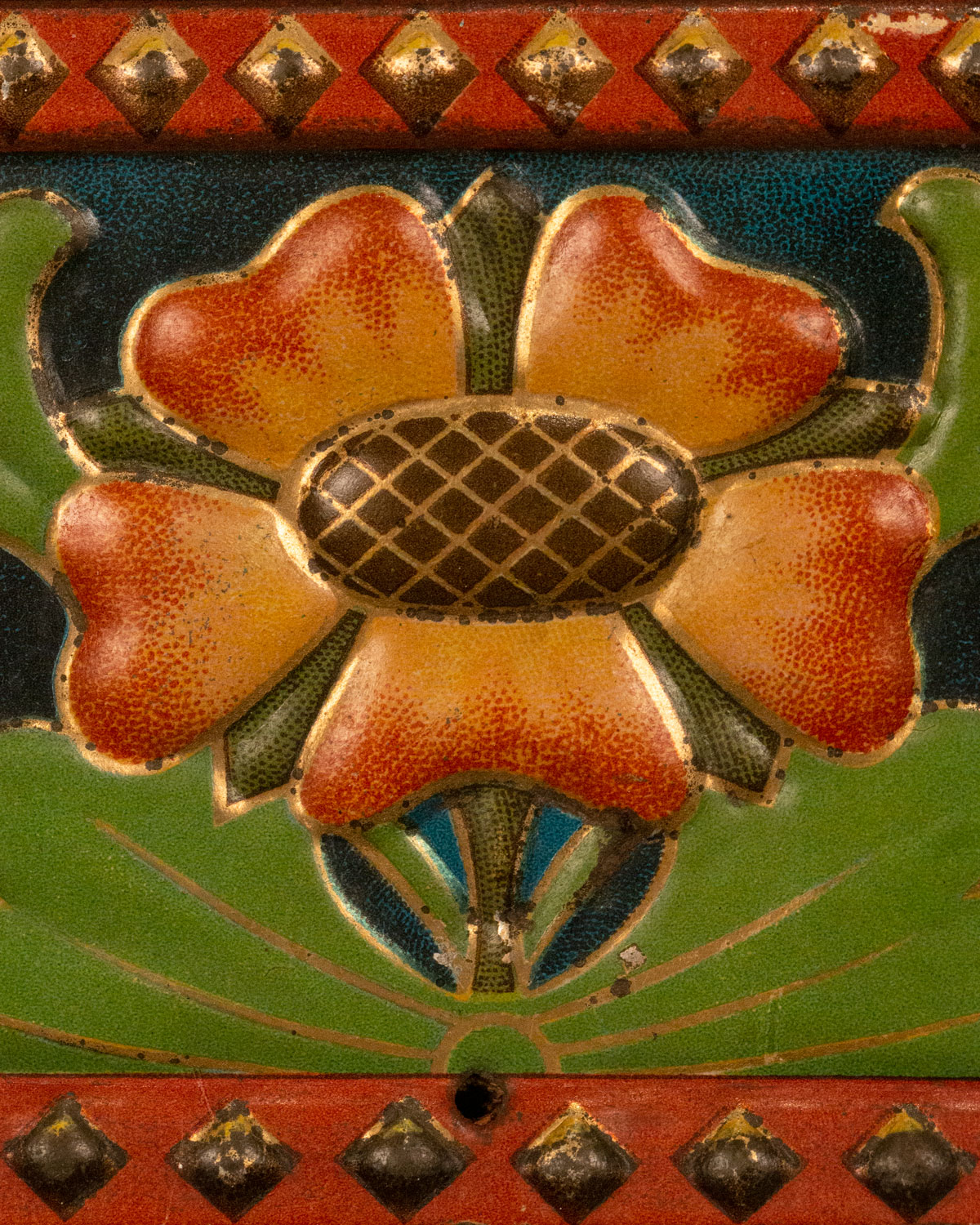 This piece is made from molded tin on a wooden base, and then paint is applied before being baked. The design is a product of the Art Nouveau style of the time, with flowing florals and vines combined with geometric shapes.