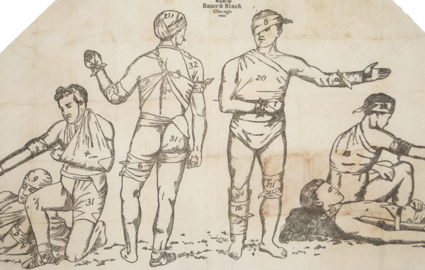 In the 1870’s, Freidrich von Esmarch, a German surgeon, developed the idea of a triangular bandage with printed instructions on the bandage itself. The intention was to prevent the loss of life by make it easier for soldiers to perform emergency first aid. The bandages could be used as tourniquets, slings, and to secure splints to broken limbs.