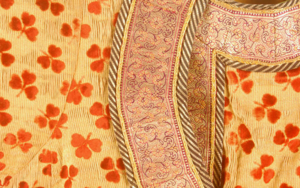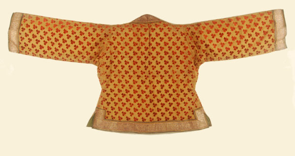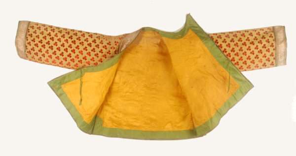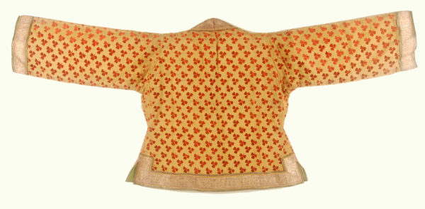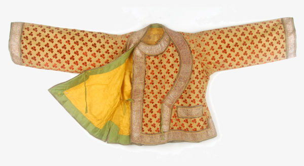 Short jacket of cut velvet with long sleeves, two front pockets and a front overflap closing to the left. The yoke (or dickey) made of the same material.The material is gold thread ground with a supplementary silk warp and silk cut velvet. It is edged with a wide silver brocade floral ribbon which is further edged with narrower ribbons, brocaded and braided. The bright yellow silk lining is edged with bright green. India, late 18th-early 19th C.