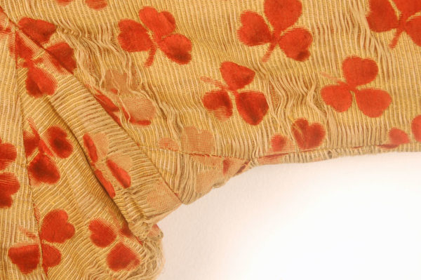 Condition: The silk float is loose in armpit and shoulder areas. It is stitched down(old repair) and stabilized. Some overall soiling to lining, but the colors seem remarkably fresh. Very good
