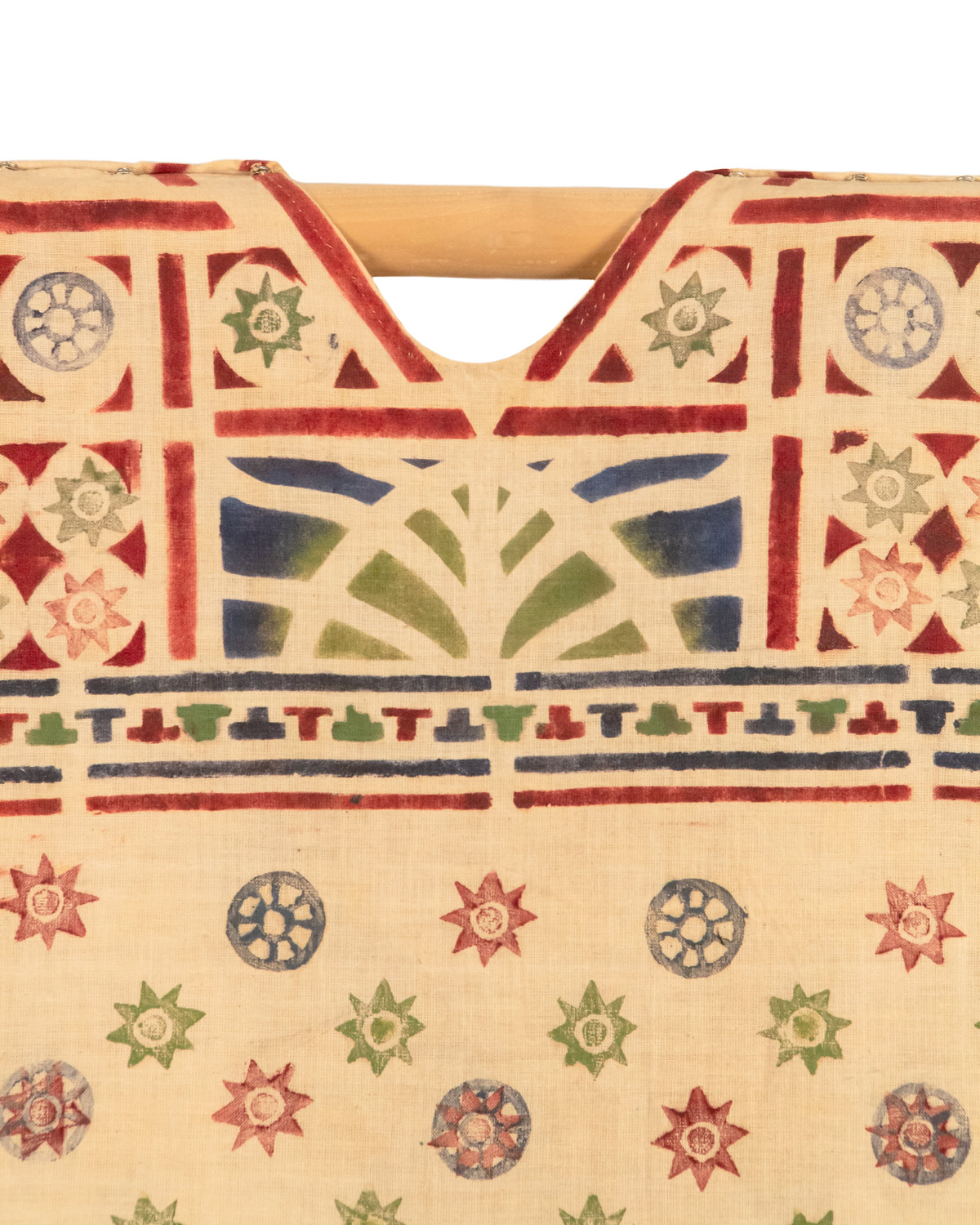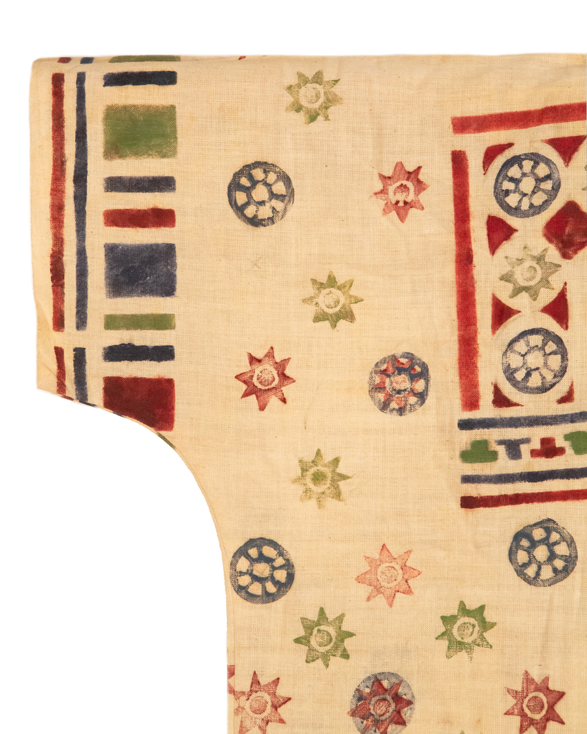 While we aren’t quite sure where this tunic is from, we believe it is from West Africa – either the Bamum people of Cameroon, or the Yoruba people of Nigeria. The tunic is made of cotton and is stamped using a block-printing method. The field consists of mostly stars and circles, while the borders use the same colors to create geometric patterns. The colors used are red, blue, and green, and the bottom is a knotted fringe.