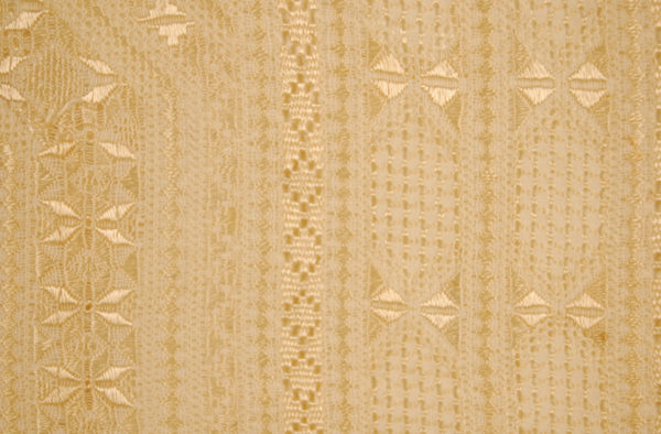 This white-work panel was made in the 19th century, likely in Persia. It is white silk on white cotton. The handwork on this embroidery was executed with counted thread straight stitches, pulled thread work and needle weaving. The design and the size indicate that it was likely meant to be used as a book or Quran cover.